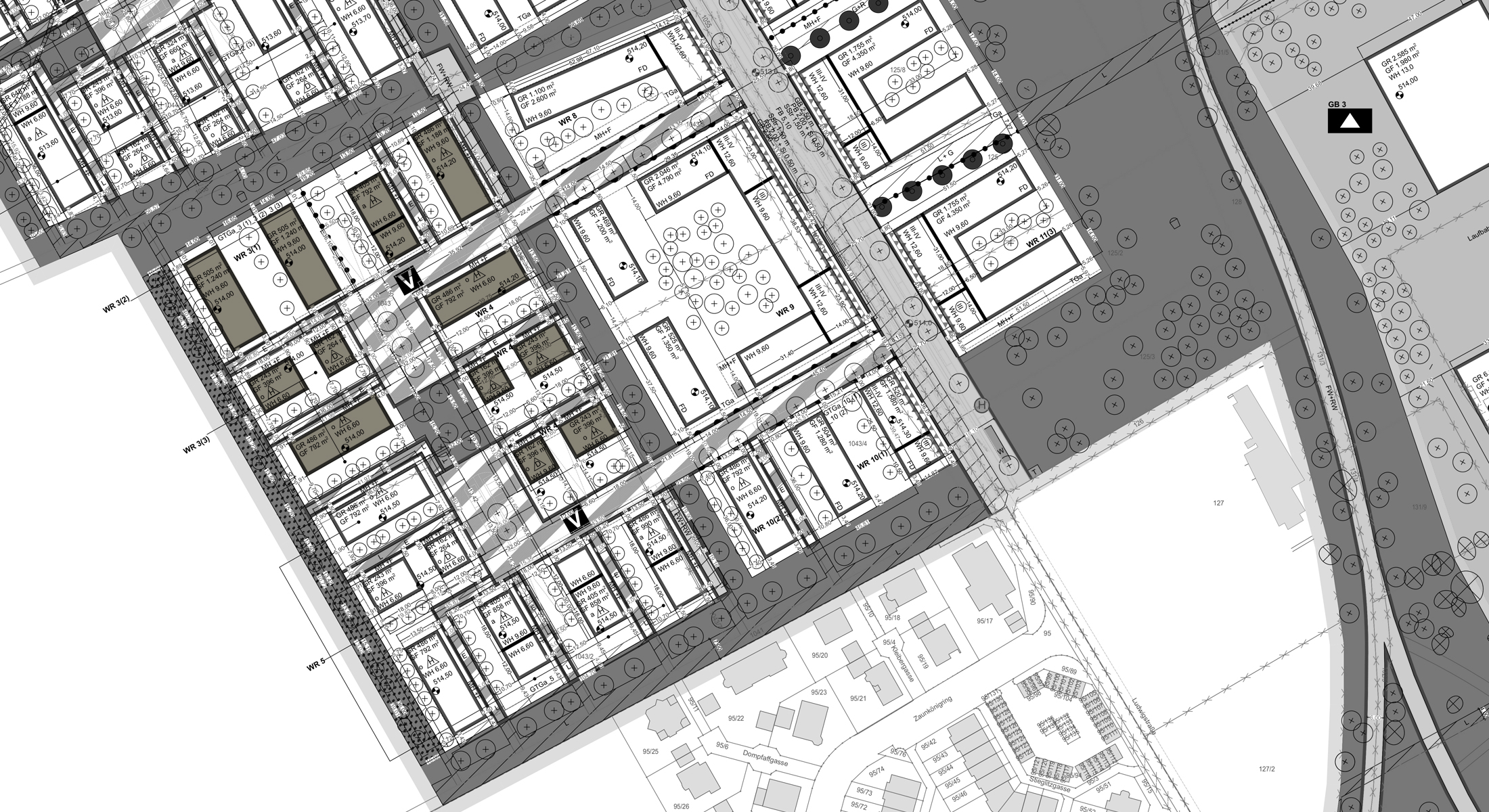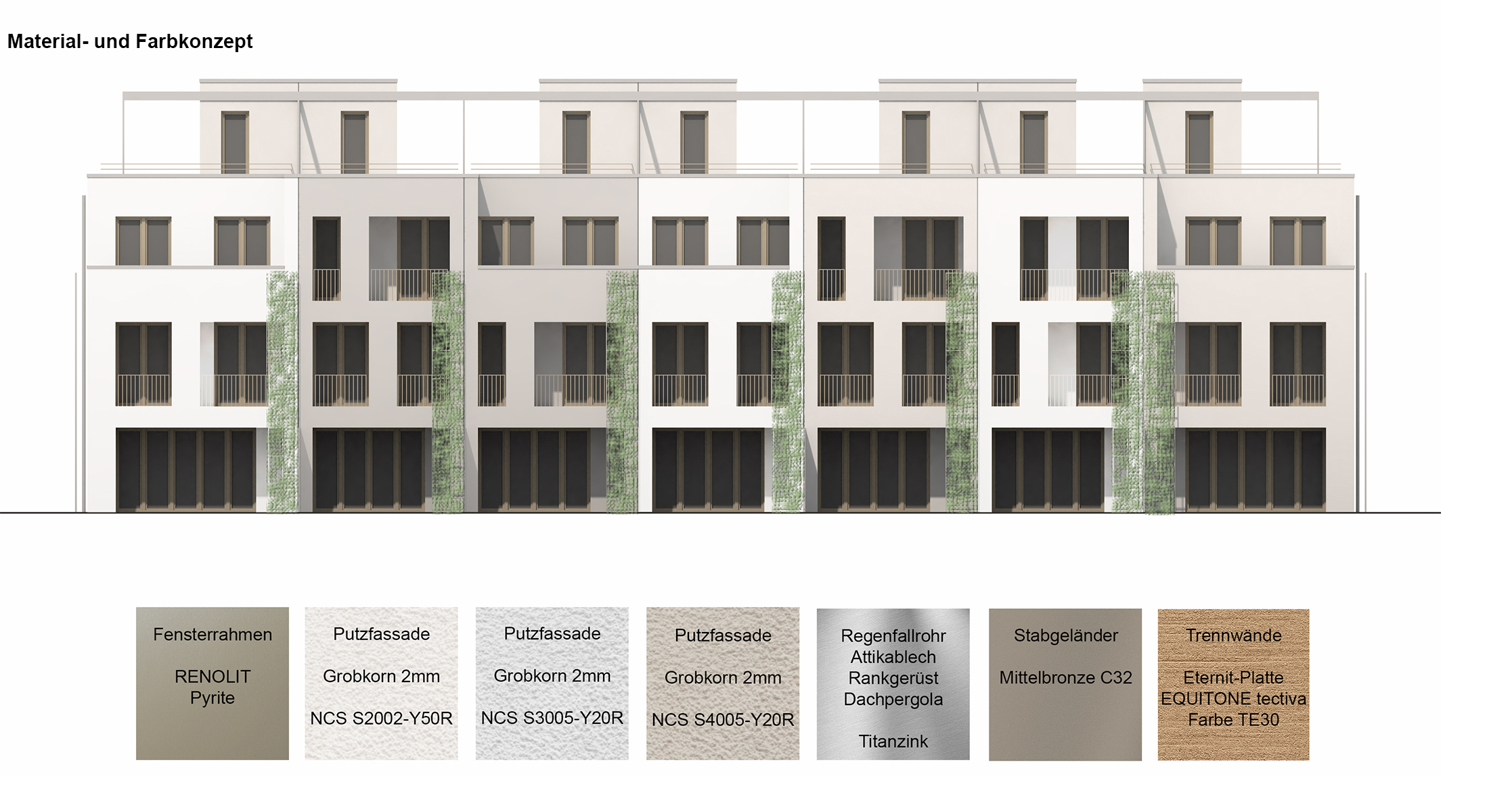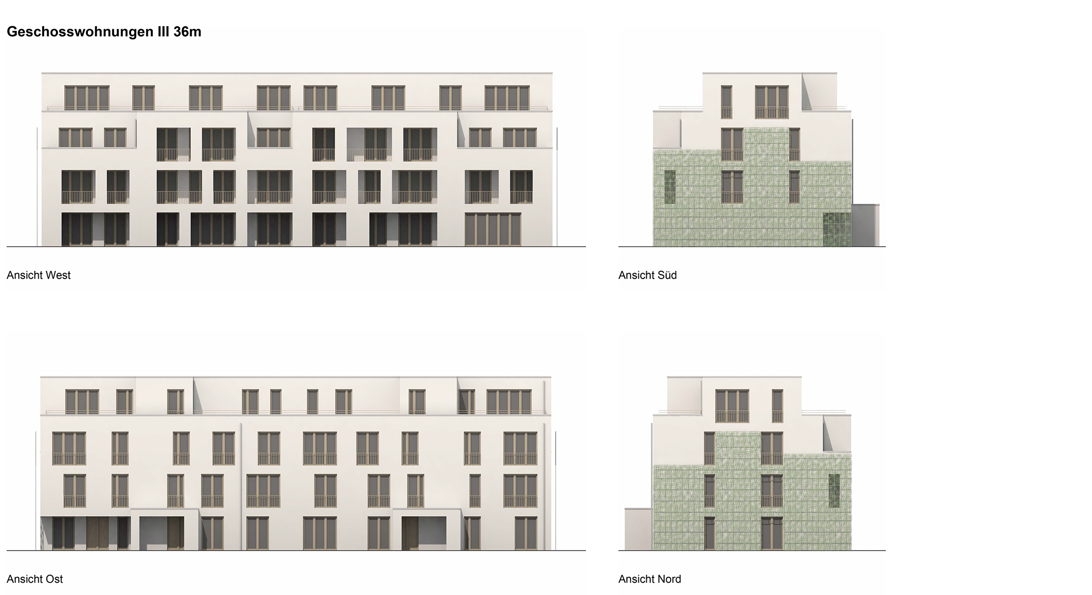 Eine Ausnutzung des Baurechts mit zusätzlichen Dachgeschossen würde zu große Wohneinheiten ergeben. Somit werden alle Baukörper mit Flachdächern und Dachterrassen konzipiert.