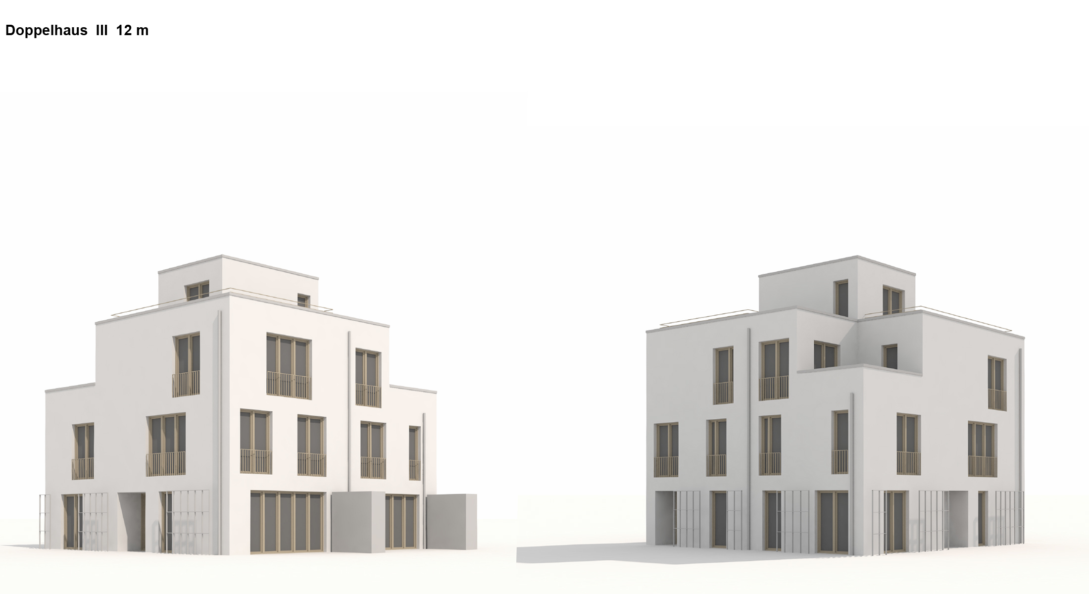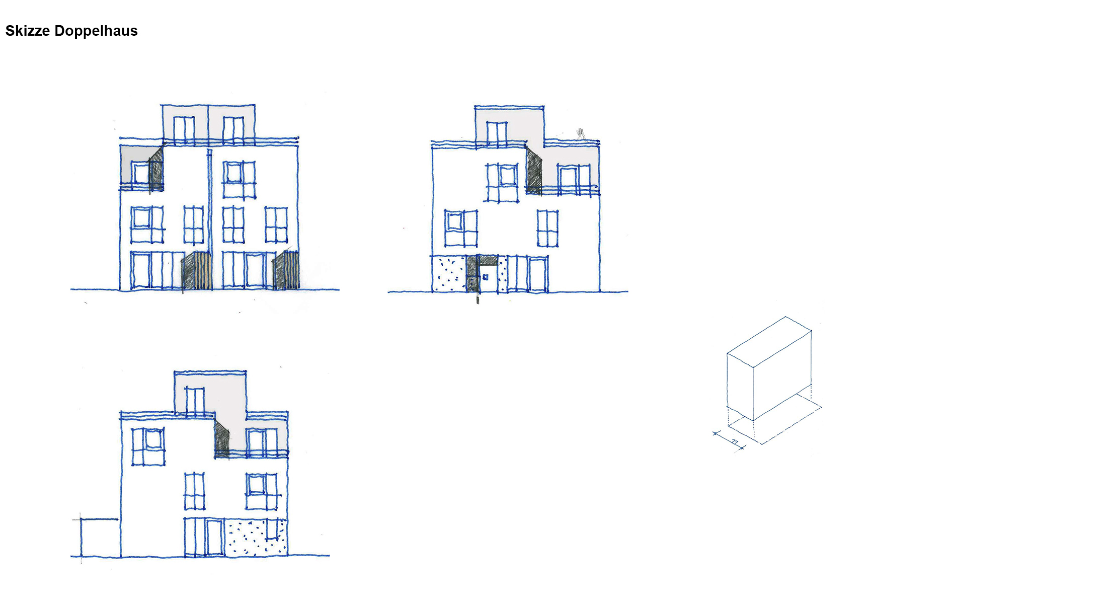 Die Länge des Bauraums ermöglicht zwei Hauseinheiten, die einheitlich mit 6 m Breite, oder asymmetrisch mit 5,5 m und 6,5 m Breite kombiniert werden können. Das hohe Doppelhaus erhält ein Flachdach mit Treppenhausaufbau. Zusammen mit kleineren Volumensubtraktionen im 2. OG entsteht eine spannungsvolle Terrassierung des gesamten Baukörpers.
