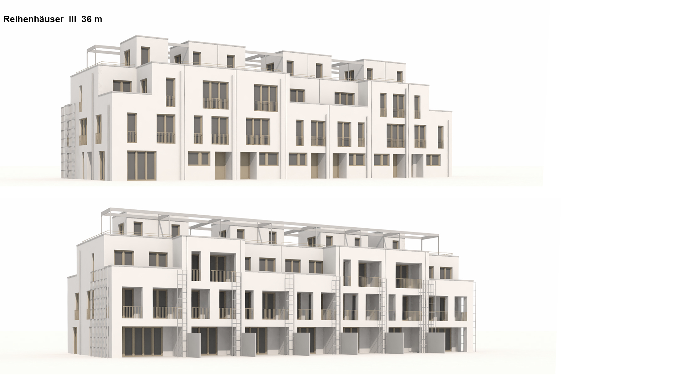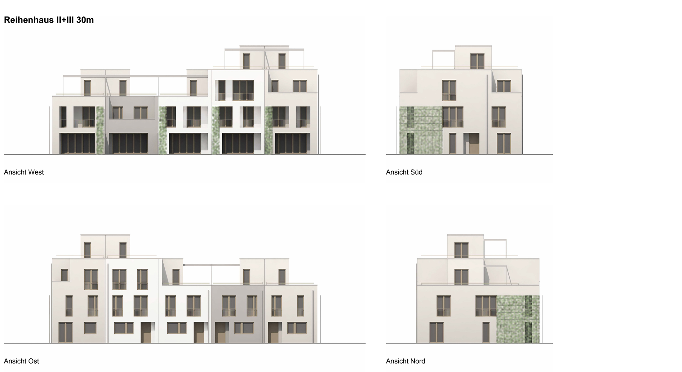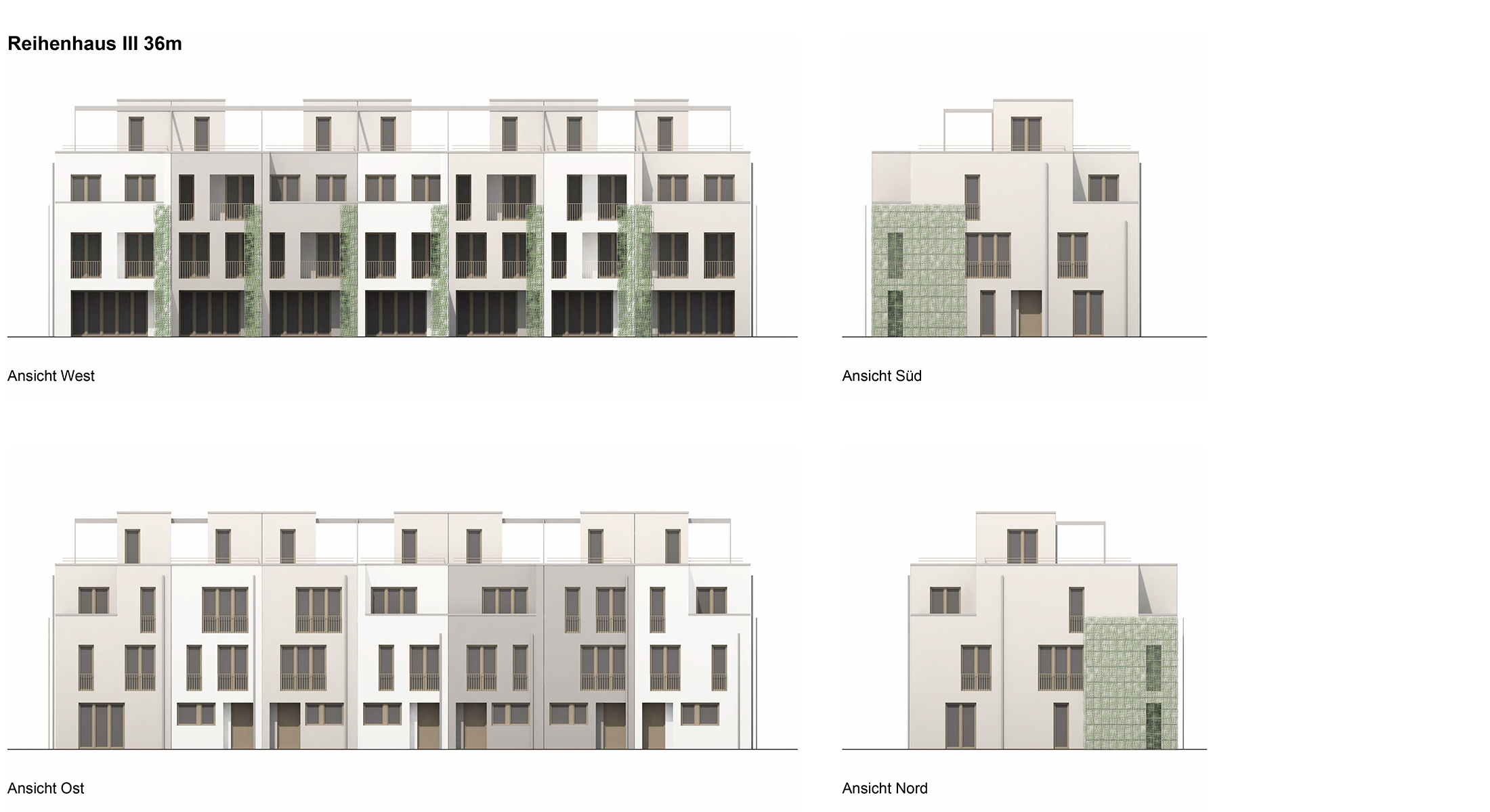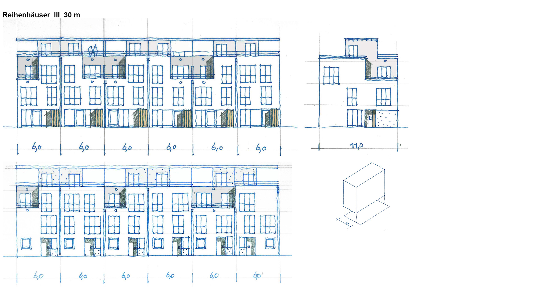 Die 3-geschossigen Reihenhäuser tendieren zu sehr großen Wohnflächen. Die Reduktion der Wohnflächen mit möglichst schmalen Haustypen ist wegen der zu geringen EG-Flächen für Wohnen, Essen, Küche nicht zielführend. Deshalb wird das baurechtlich zulässige Dachvolumen nicht vollständig ausgenutzt. Die Länge des Bauraums ermöglicht je nach Breite eine unterschiedliche Anzahl an Hauseinheiten. Es ergeben sich Hausbreiten mit einheitlich 6 Metern, oder eine Kombination aus variablen Hausbreiten von 5,5 m, 6,0 m und 6,5 m.