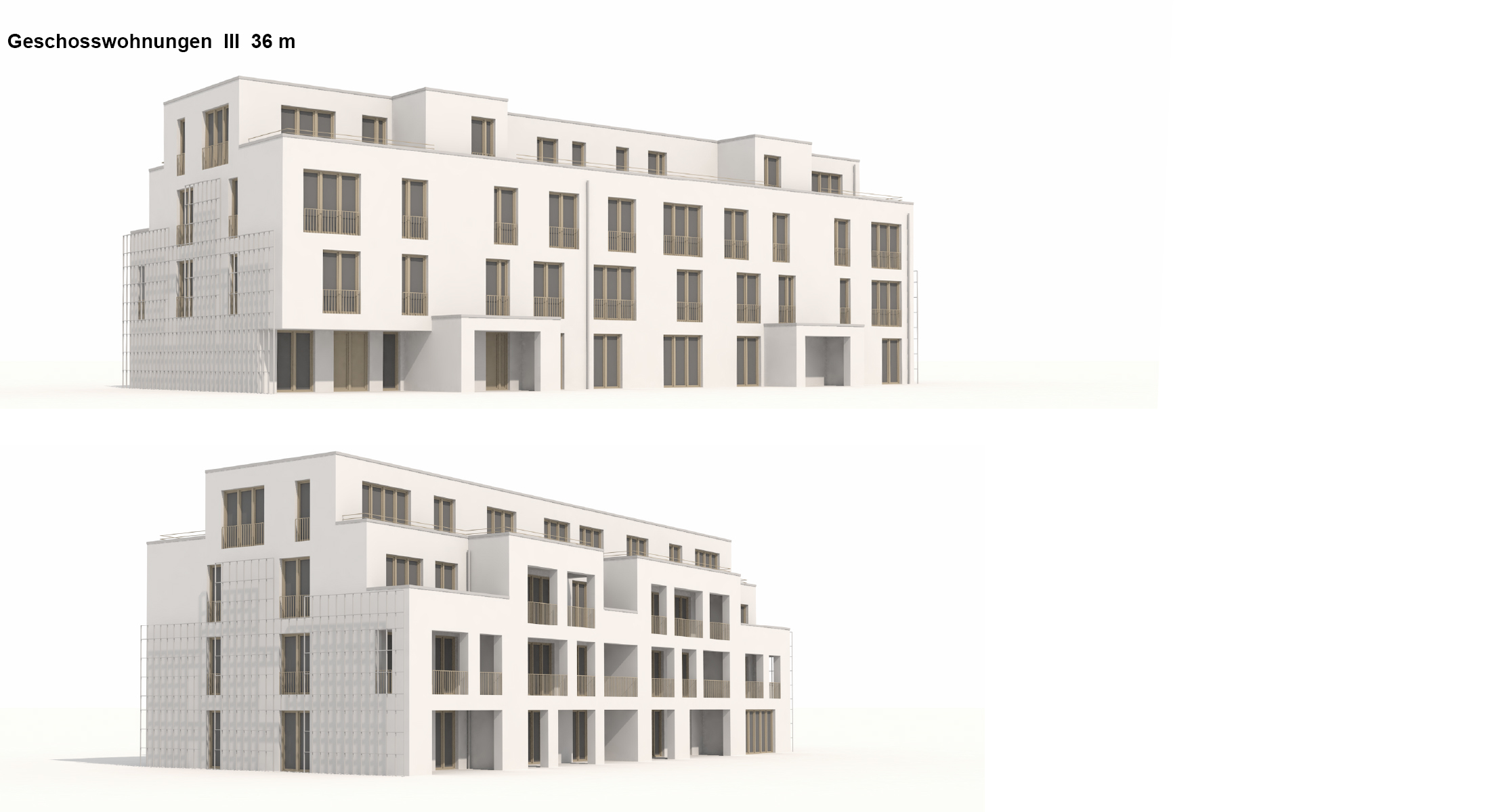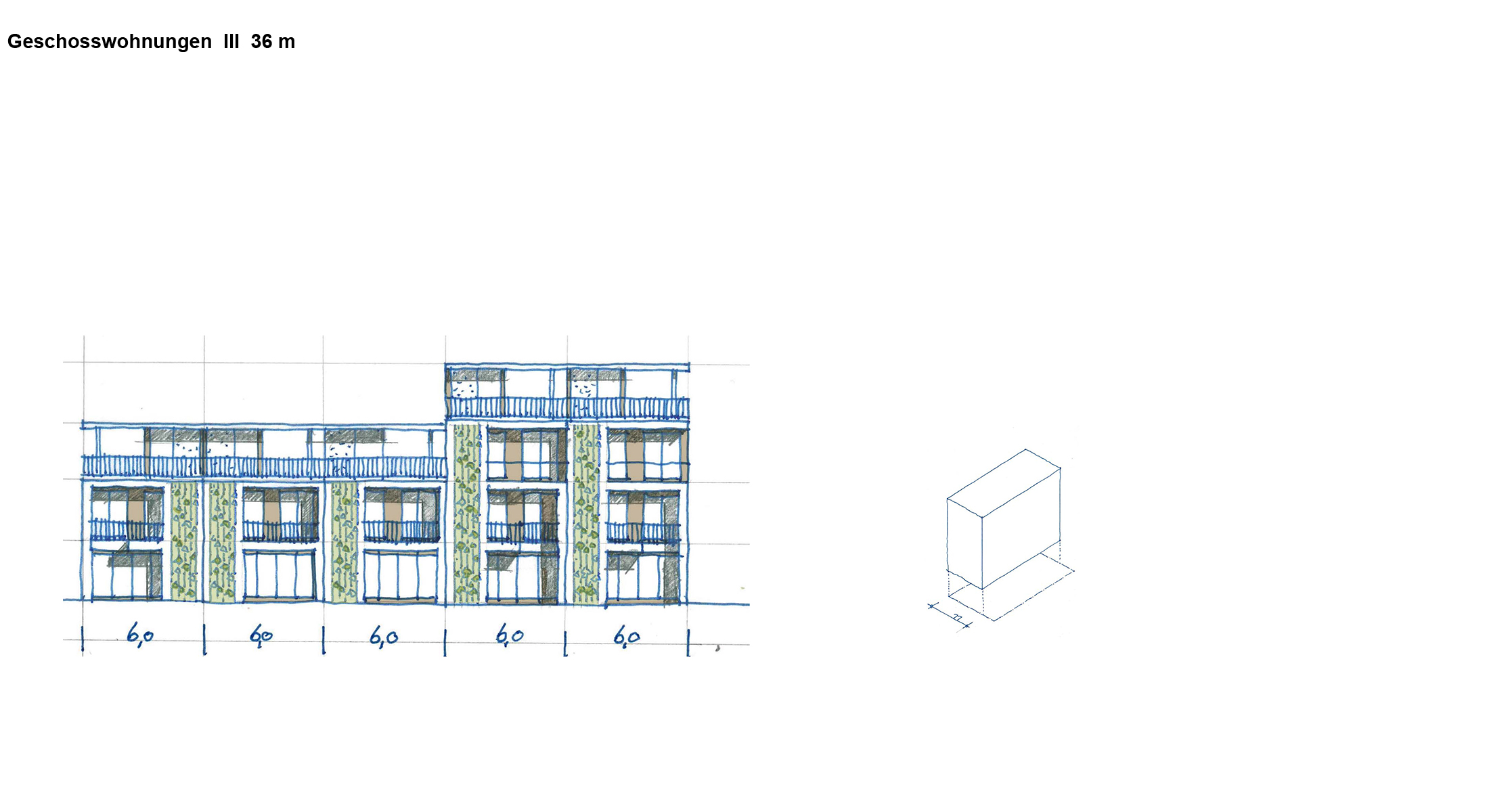 Die Länge des Bauraums führt zu zwei Häusern, die jeweils eine 2-Spänner-, bzw. 3-Spänner-Erschließung aufweisen. Analog zu den Doppelhäusern und Reihenhäusern erhalten auch die Geschosswohnungsbauten ein Flachdach mit einer differenzierten Ausgestaltung des Dachgeschosses in Verbindung mit Dachterrassen. Die Dachterrassen sind mit Pergolastrukturen überdacht.