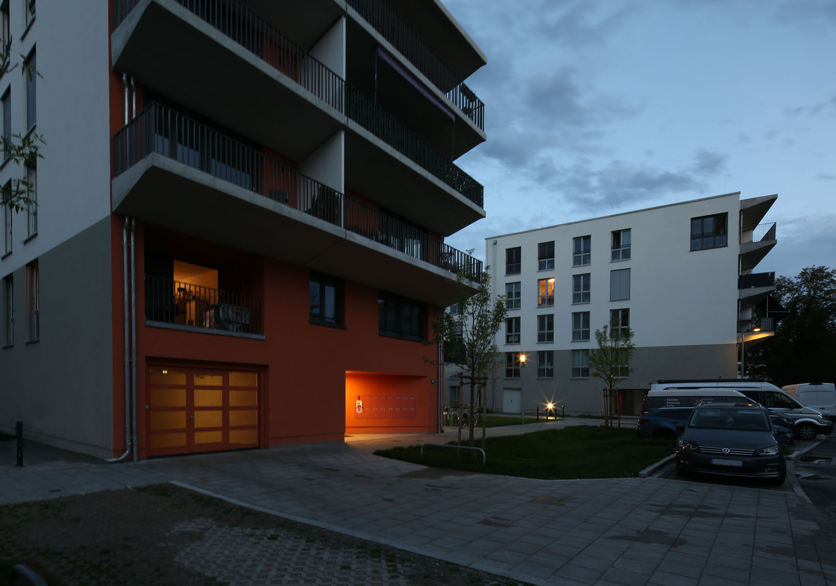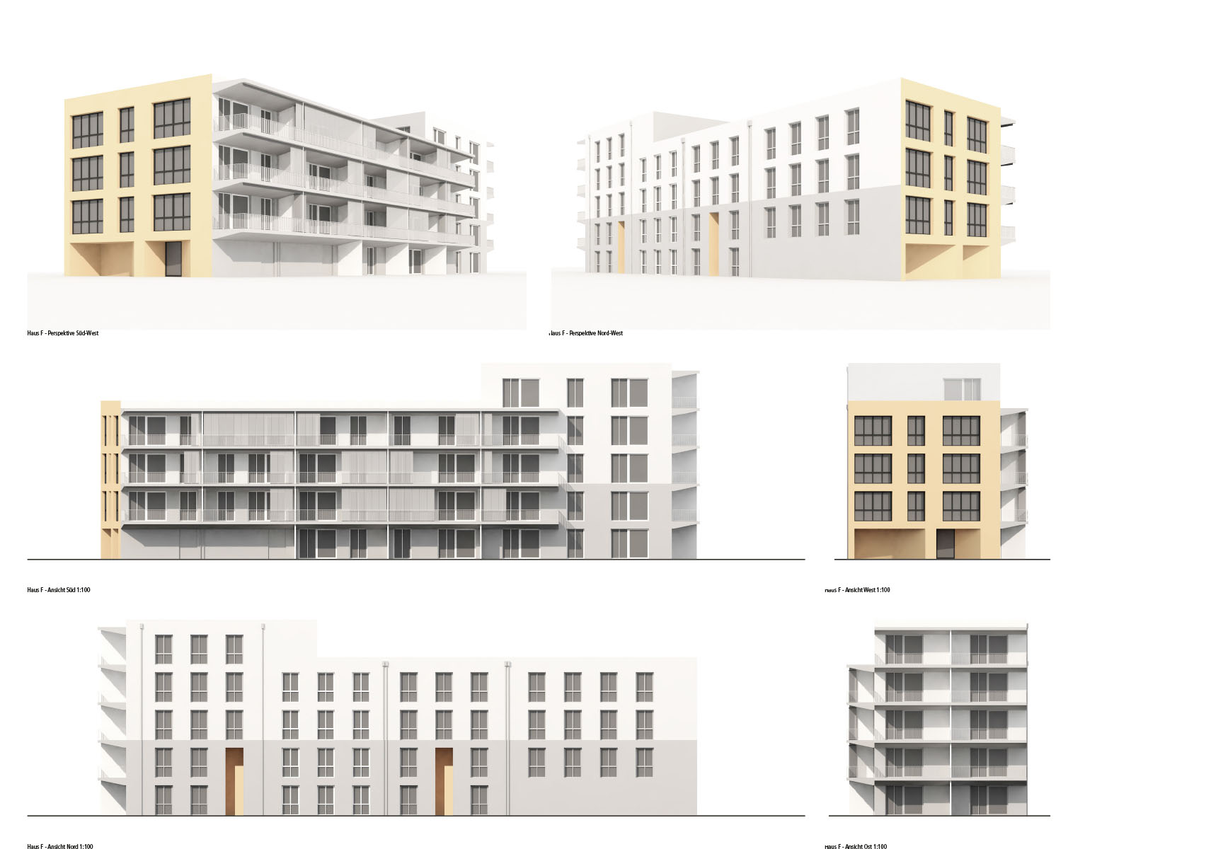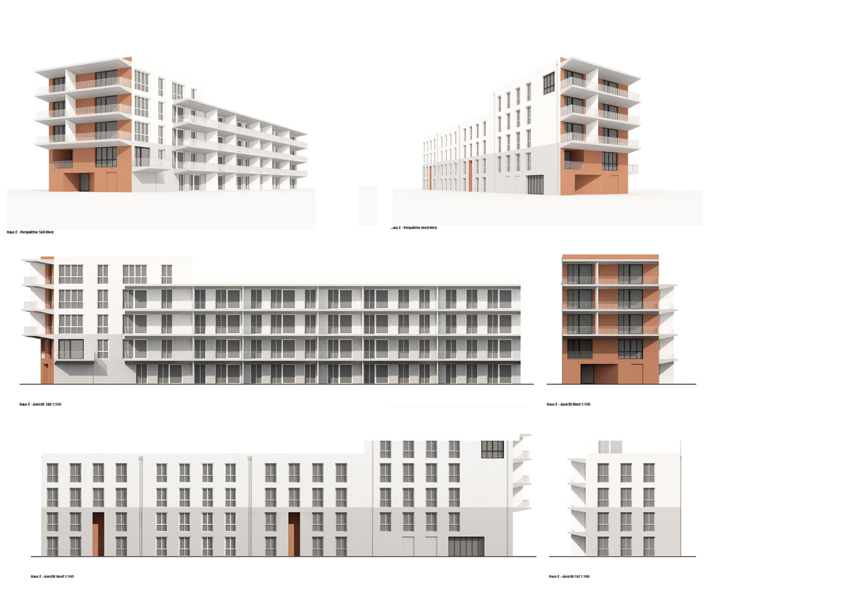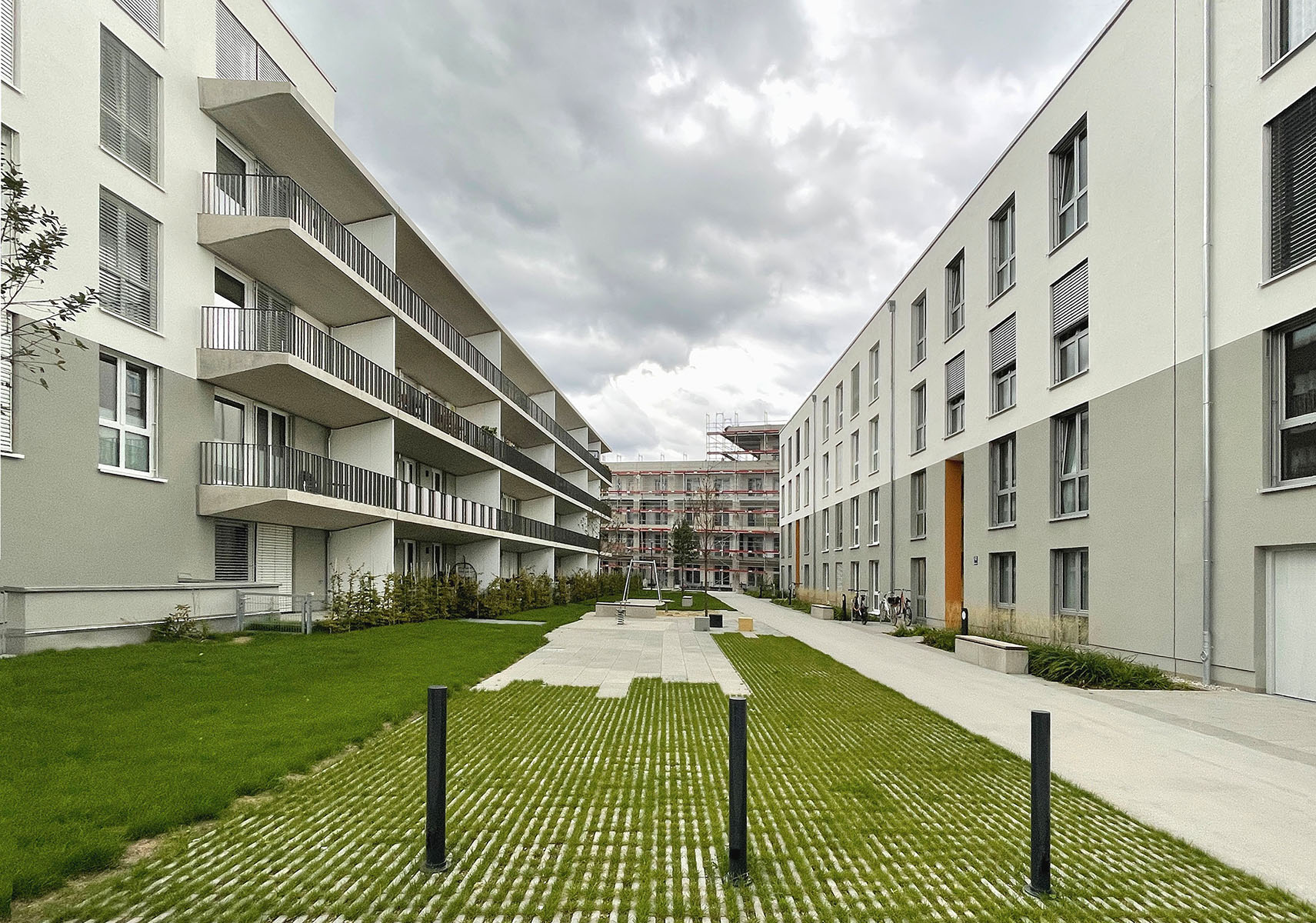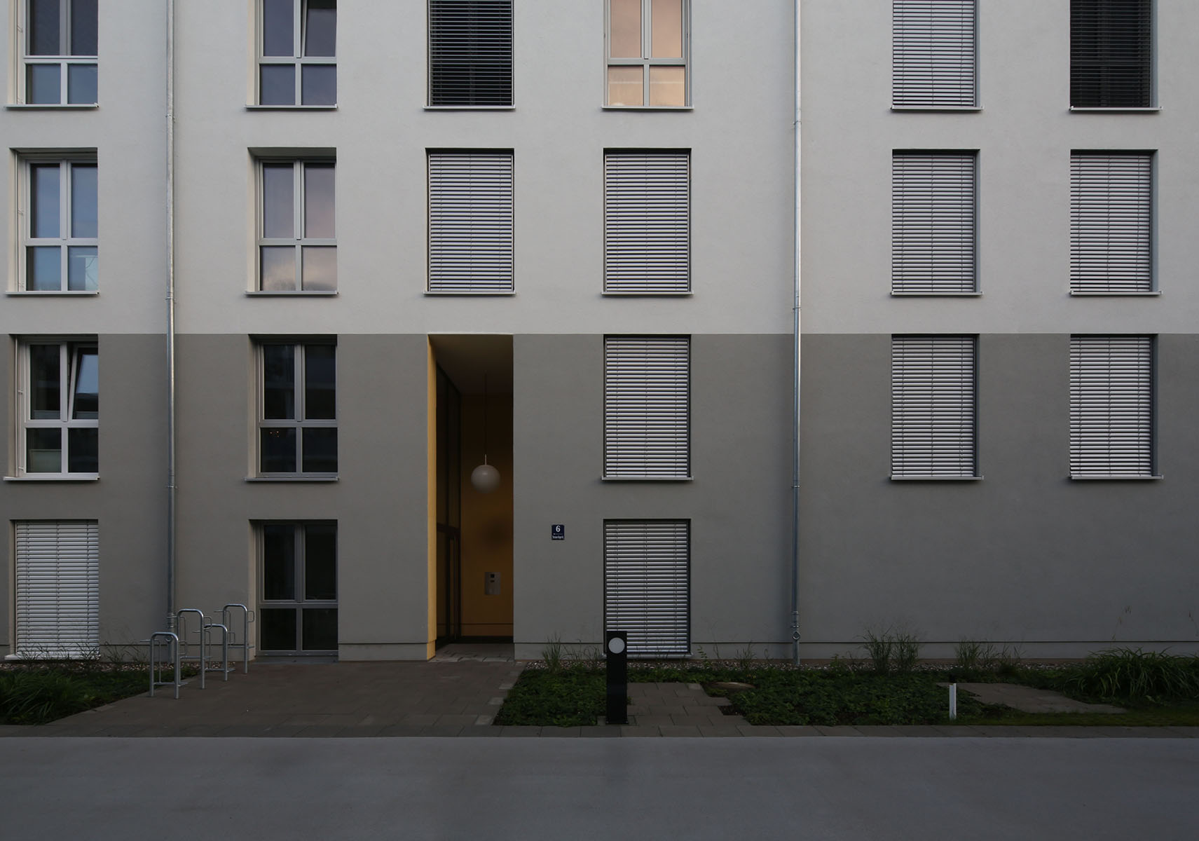 Die drei 4-geschoßigen Hauszeilen haben eine eindeutige Süd-Nord-Orientierung. Aufgrund der überwiegenden nach Süden ausgerichteten Wohnungen unterscheiden sich Süd- und Nordfassaden deutlich. Die Südfassaden sind geprägt von durchlaufenden Balkonzeilen, die die unterschiedlich breiten Wohneinheiten gleichmäßig und ruhig zusammenfassen. An den durch ein zusätzliches Geschoß städtebaulich hervorgehobenen Zeilenköpfen dreht sich die Ausrichtung der Balkone und Wohnungen auf die Stirnseite der Gebäude. Damit erfahren der öffentliche Raum sowie die Blickachsen quer zum öffentlichen eine deutliche Betonung, die farblich zusätzlich unterstützt wird. An den Nord- und untergeordneten Stirnfassaden sind Fenstertüren mit durchgängig einheitlicher Größe zu streng gerasterten Fenstergruppen zusammengefasst.
