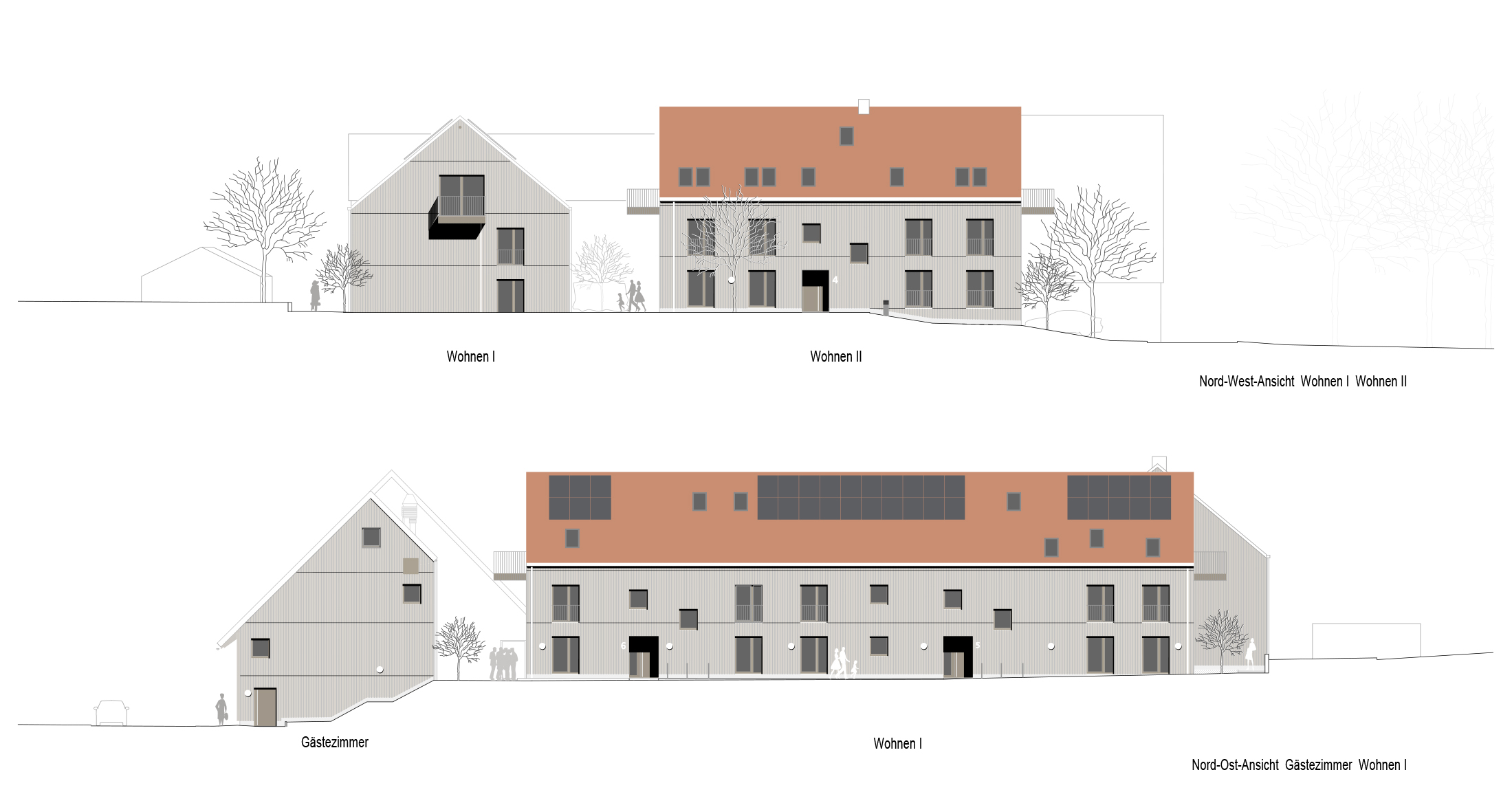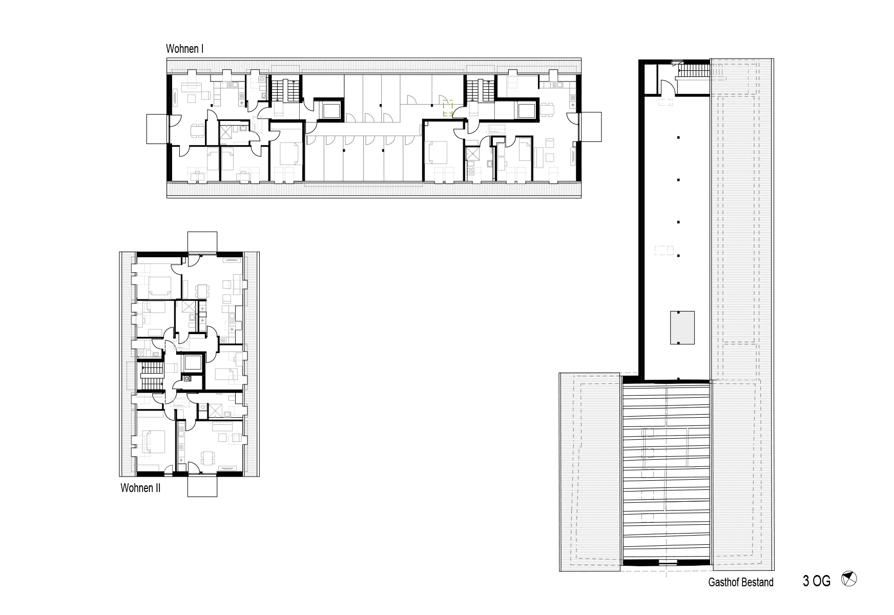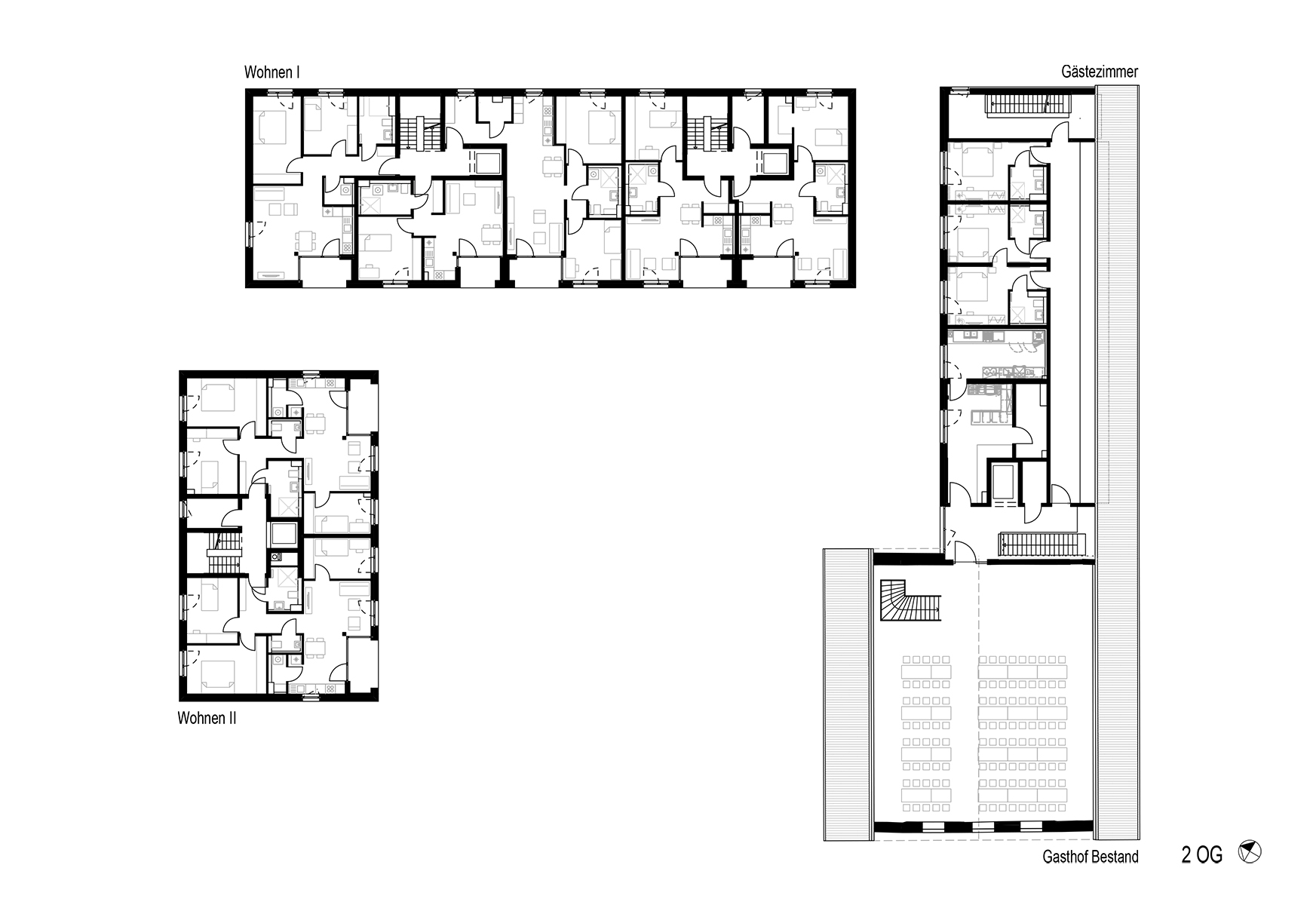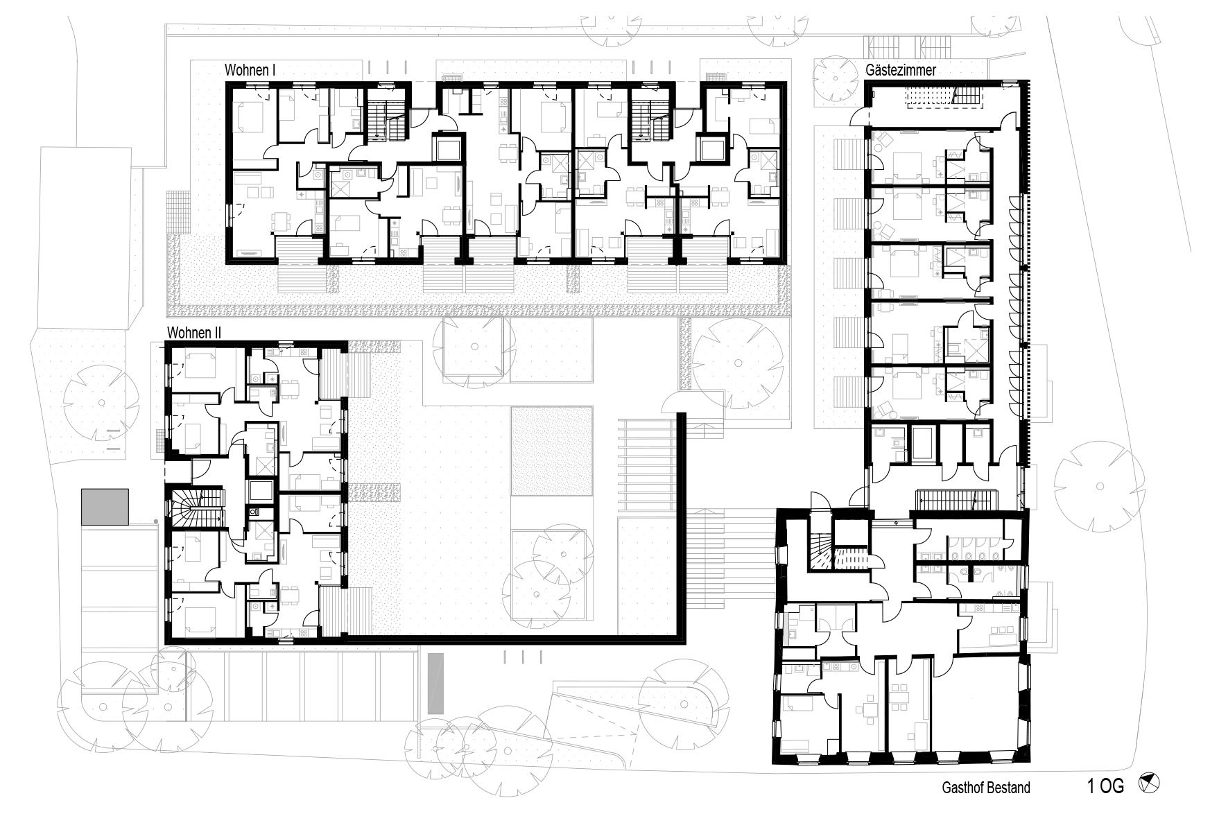 Der Gasthof bildet mit zwei Wohngebäuden im Osten und Norden des Planungsgebiets einen großzügigen, 3-seitig gefassten, nach Westen offenen, ruhigen und grünen Hofraum, auf den sich alle Wohnungen und die Gästezimmer des Gasthofs orientieren. Das Niveau des Hofes entwickelt sich aus den hangseitigen Geländehöhen und bildet ein gegenüber dem Gasthof und dem Wirtshalder Weg ein um circa ein Geschoß angehobenes Gartenplateau. Darunter ,auf EG-Niveau, liegt die Garage und der Dorfladen, der sich nach Westen zum Dorfplatz öffnet.