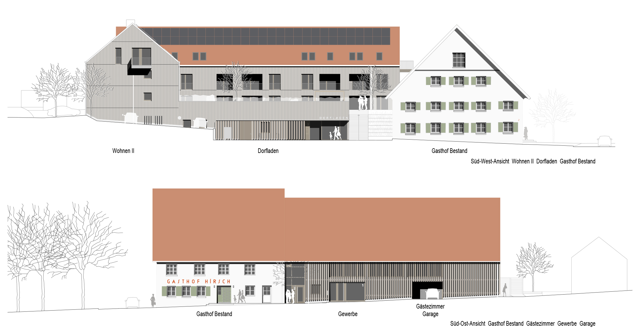 Der historische Gasthof Hirsch, befreit von später angefügten Nebengebäuden, wurde als identitätsstiftendes Gebäude erhalten und ist zentraler Baustein des neuen Areals. Seine ortsbildprägende Dominanz wird durch einen annähernd gleich langen Ersatzbau, anstelle des abgebrochenen Wirtschaftstrakts, bewahrt und bietet der dahinterliegenden Wohnbebauung einen wirksamen Schutz vor dem Lärm der Hauptstraße.