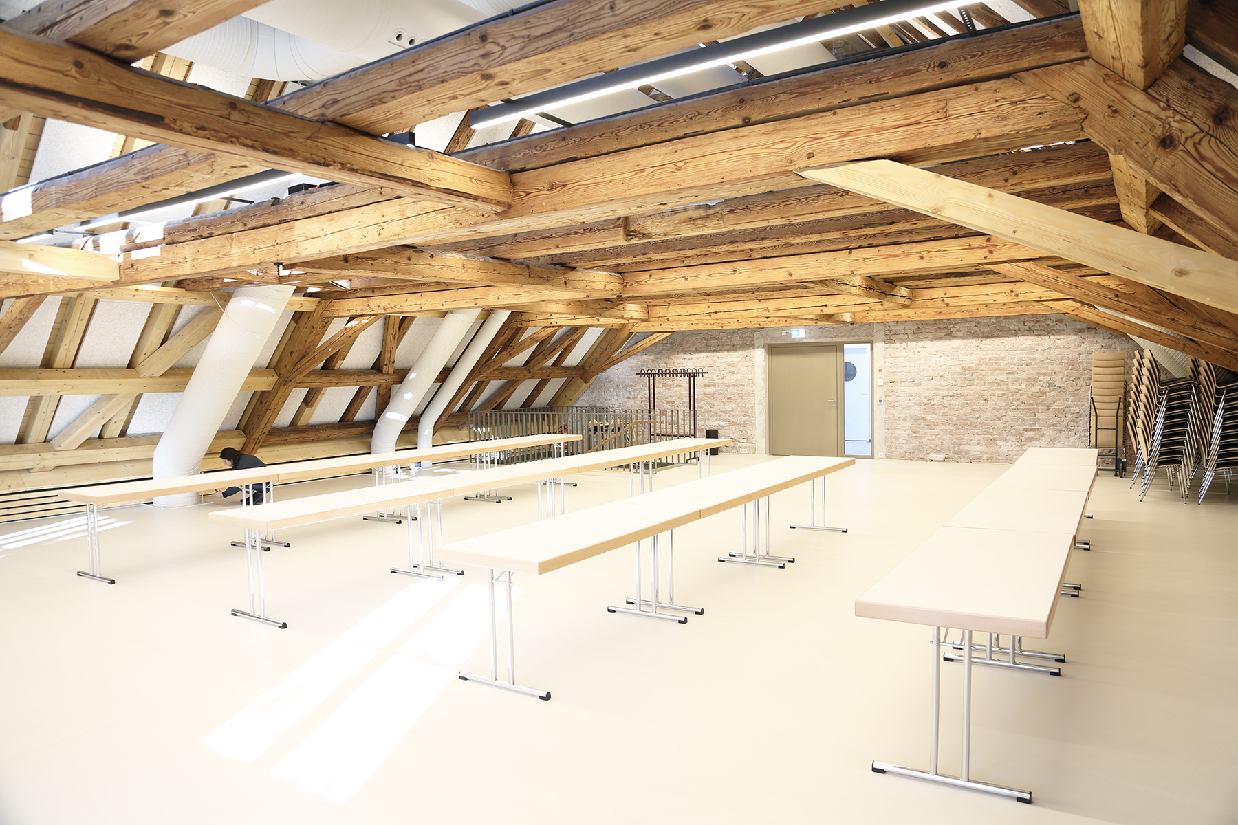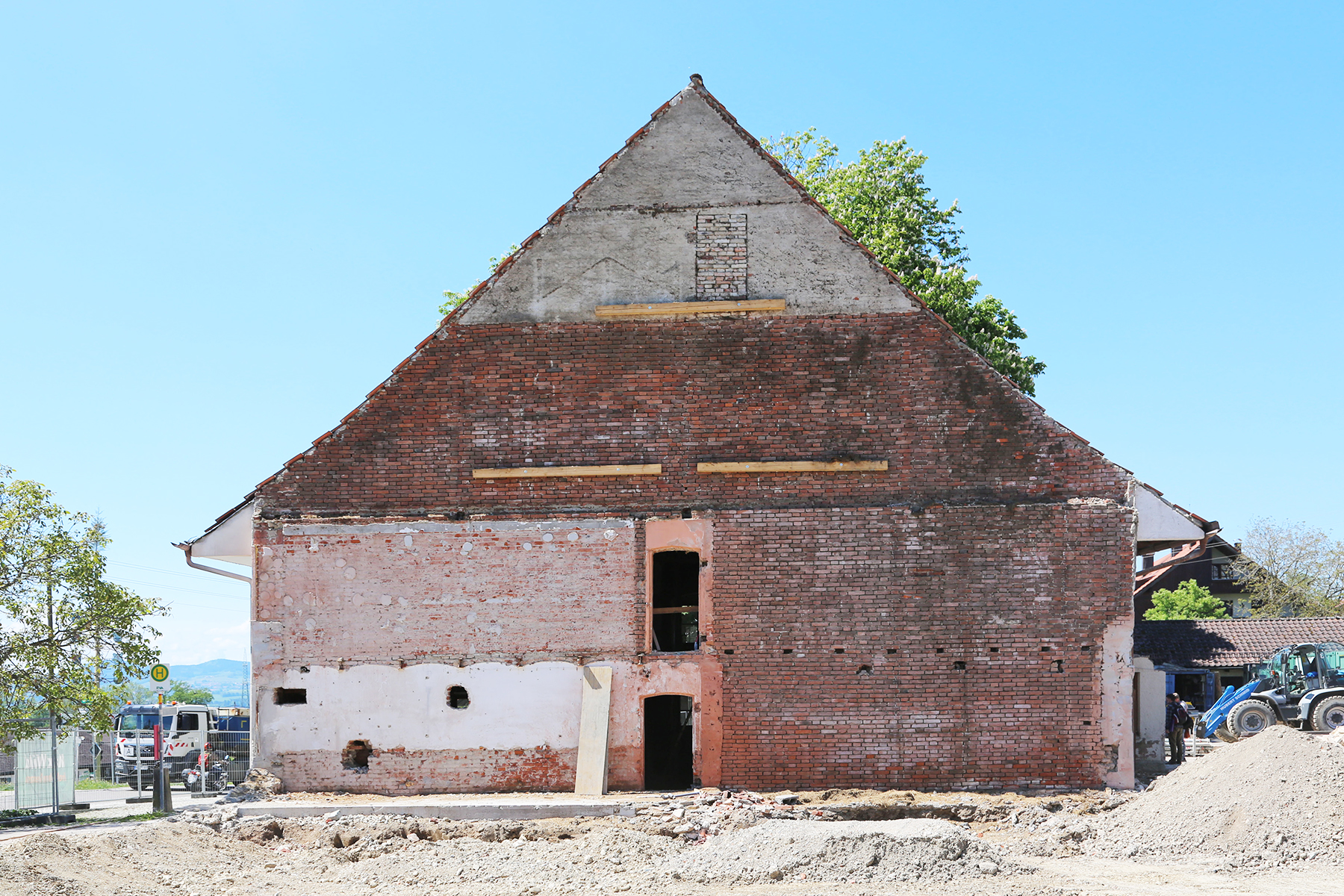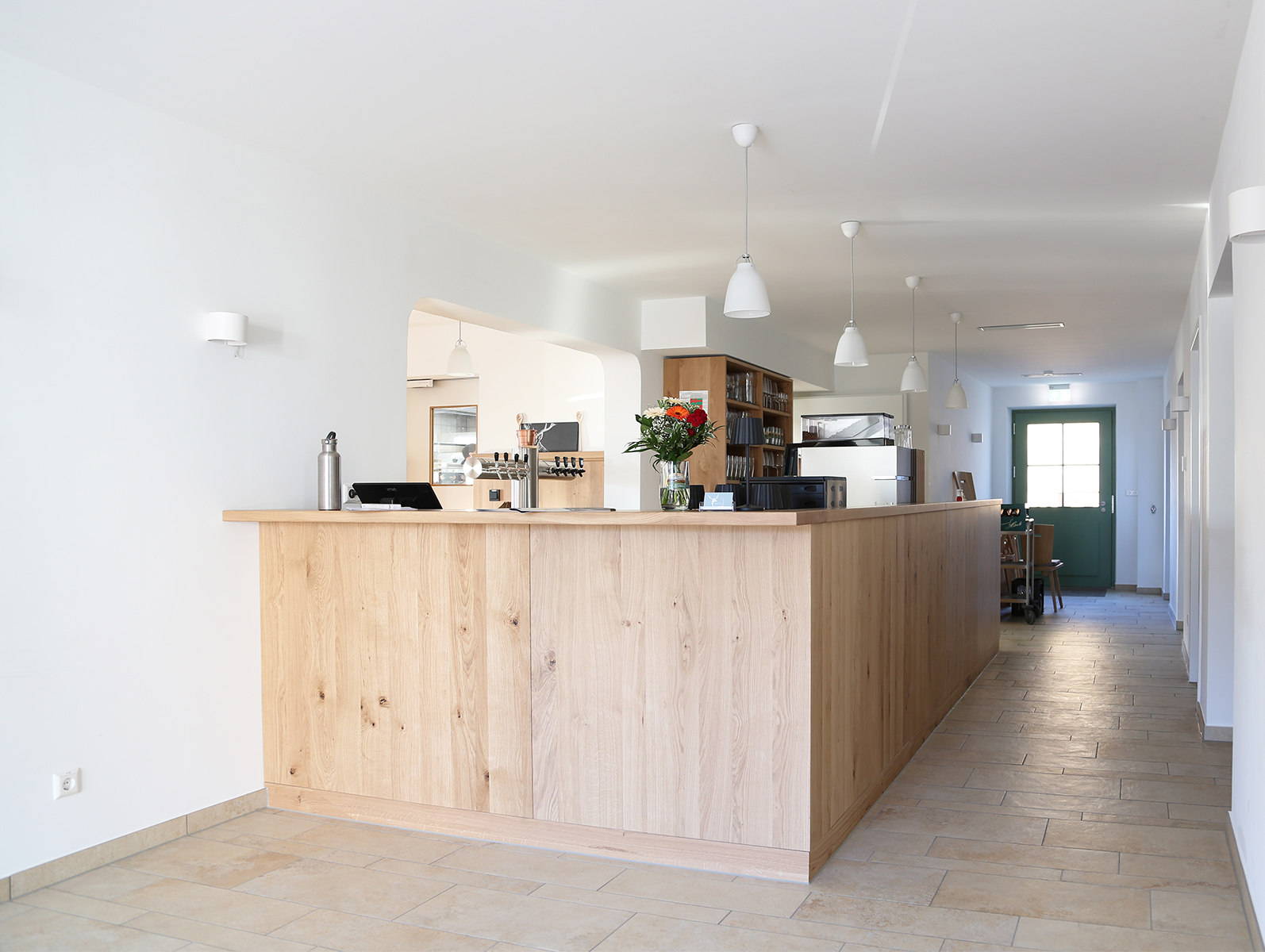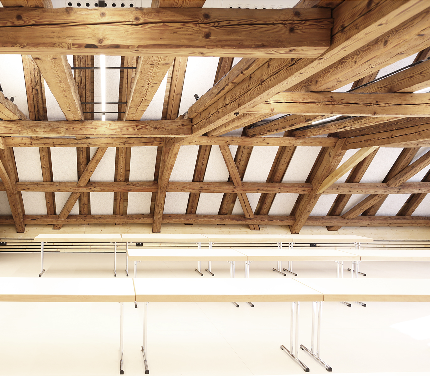 Die Bausubstanz wurde in großen Teilen gewahrt und durch konstruktiv erforderliche Bauteile ergänzt. Die Massivität des Baukörpers und der alte Charakter bleiben trotz des Einsatzes von WDVS durch traditionelle Putztechniken erhalten. Genauso feinfühlig wurden die Innenräume bearbeitet, wobei sich ergänzte Bauteile nicht verstecken. Gezielt wurden bestehende Materialien, wie das Bruchsteinmauerwerk im WC und die Ziegelwand im Foyer freigelegt und der imposante Holzdachstuhl im Saal inszeniert.