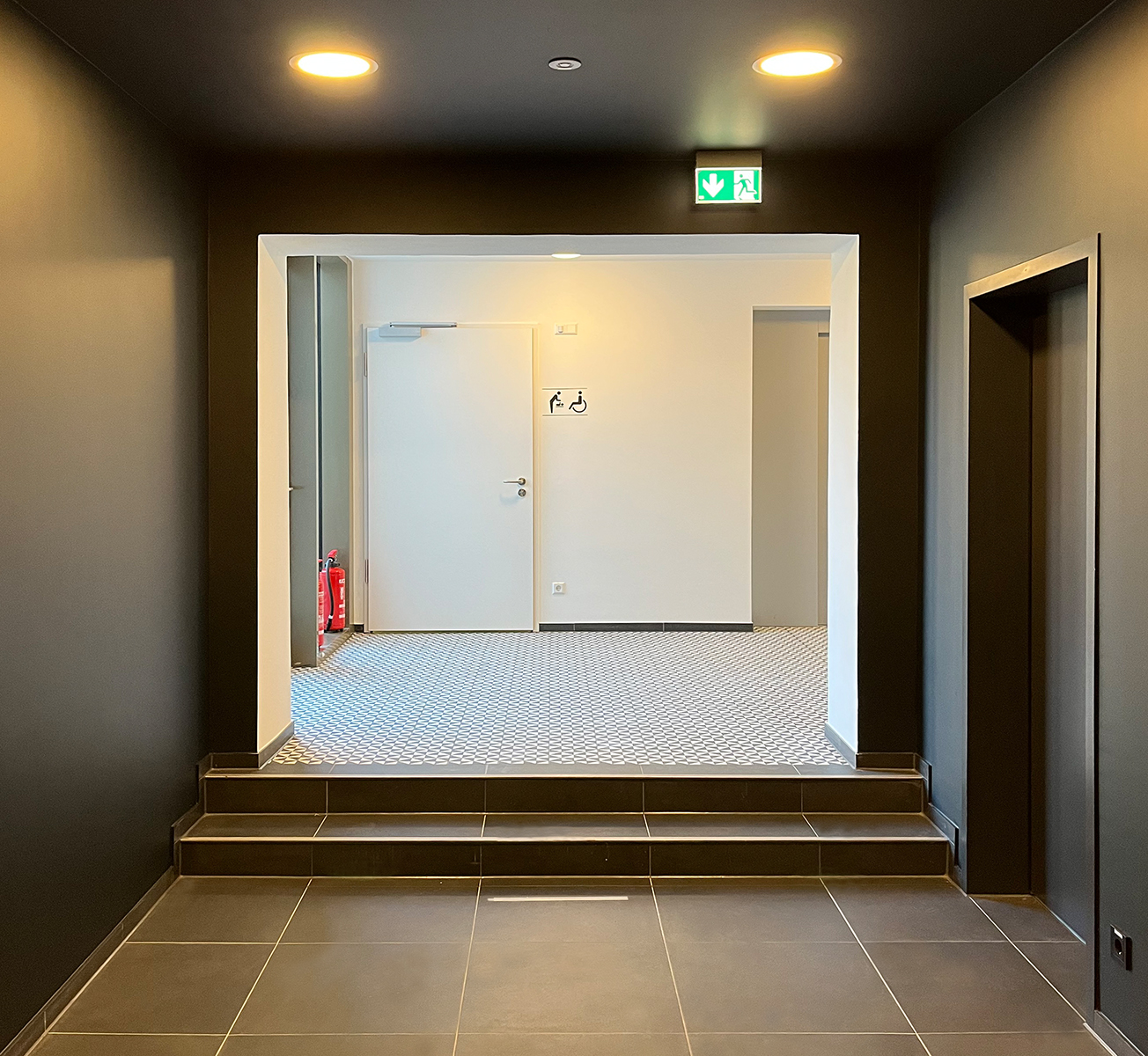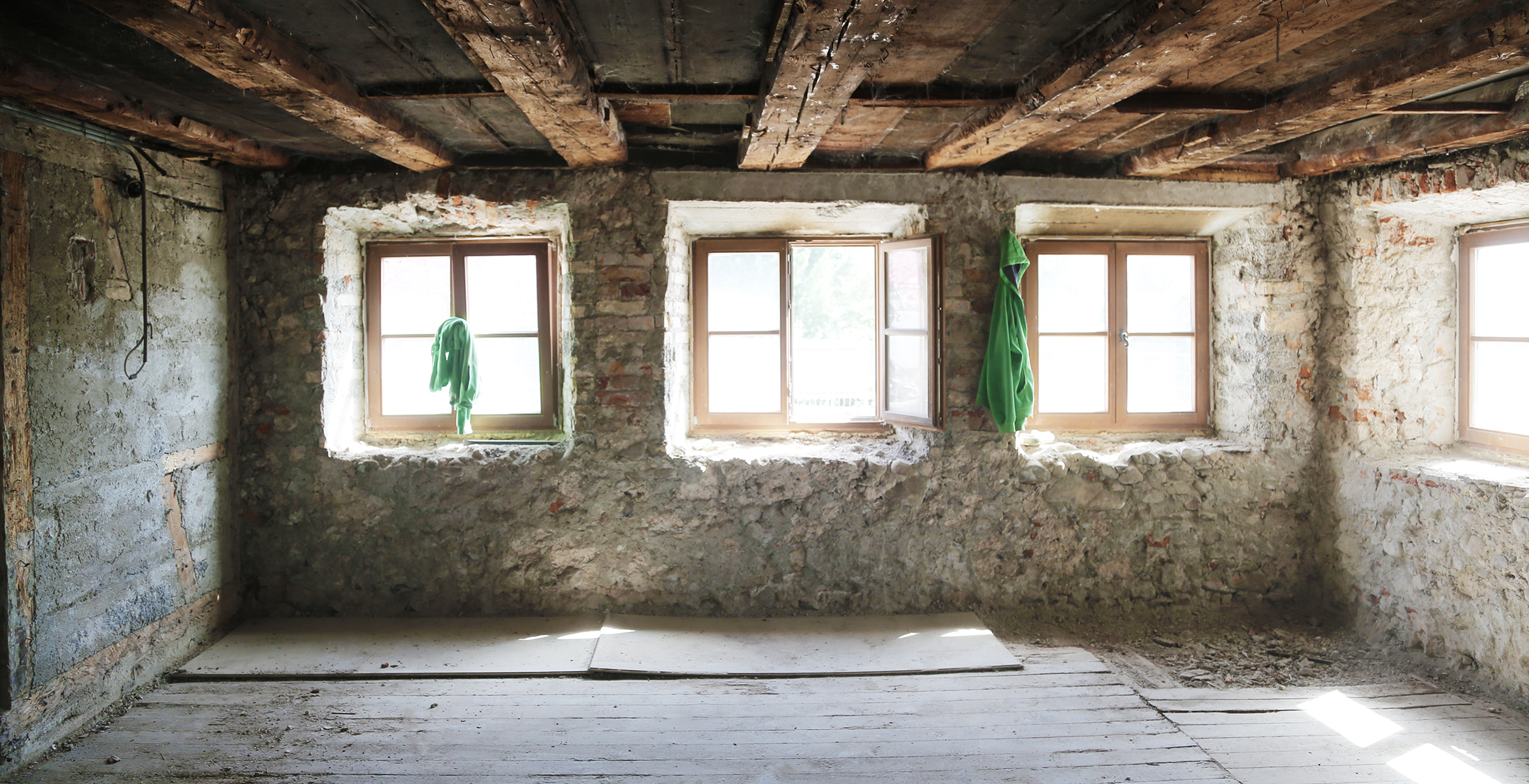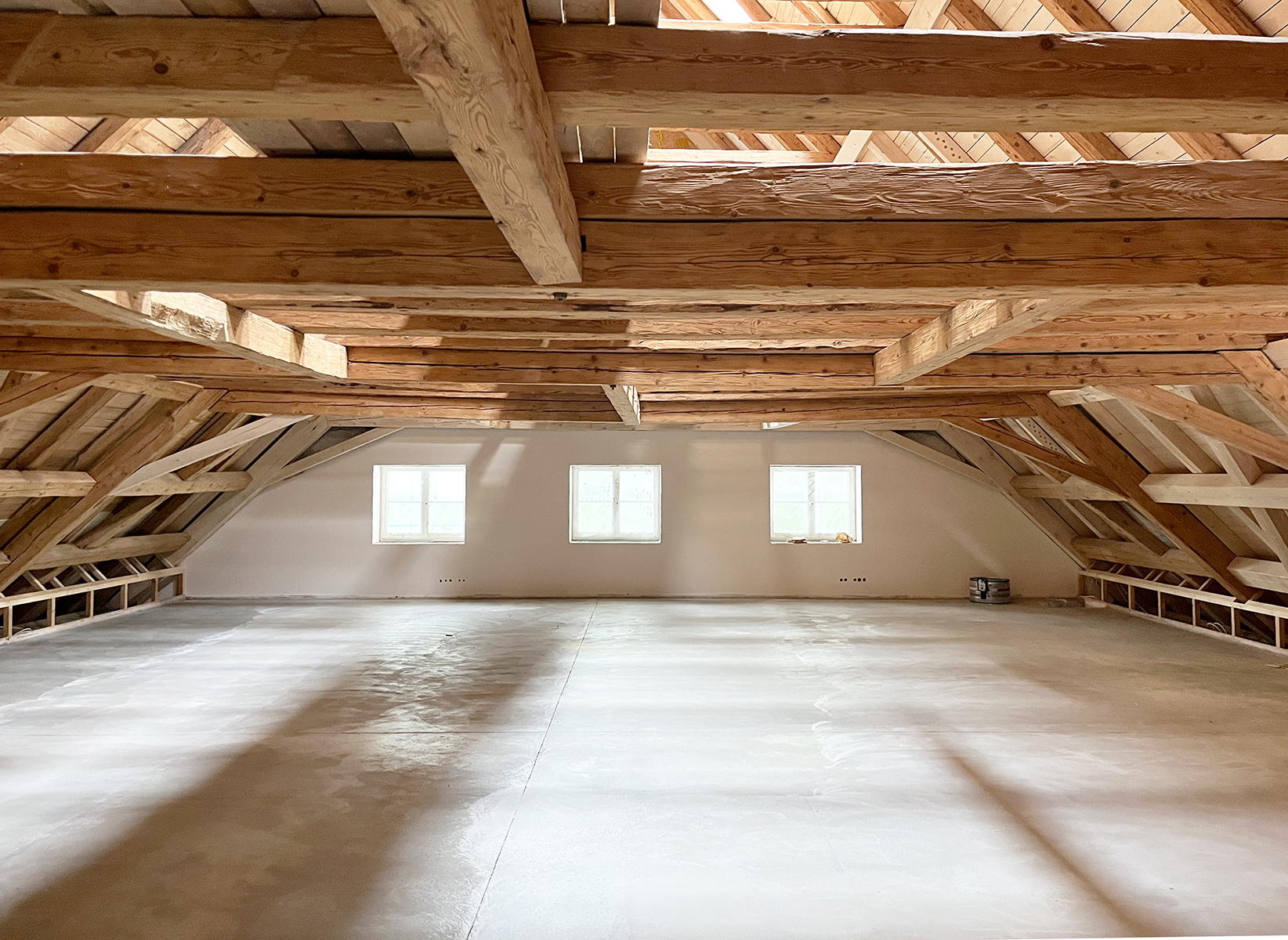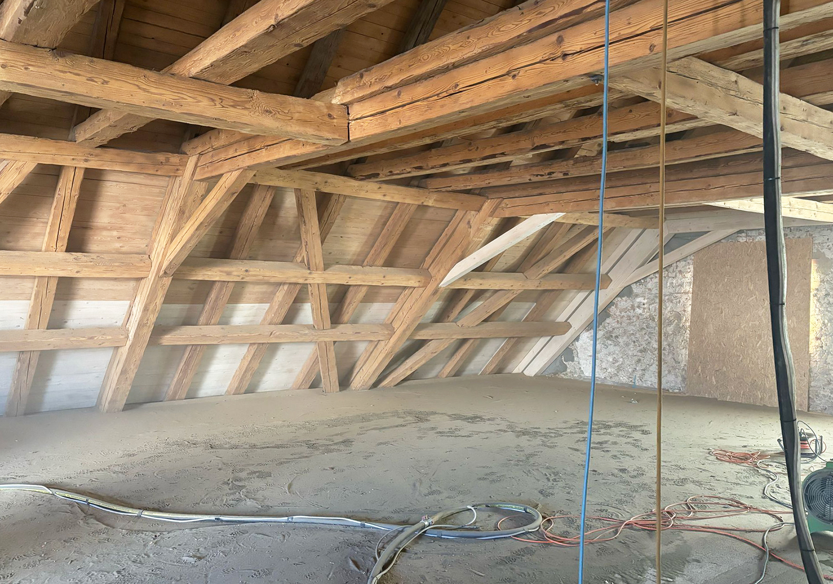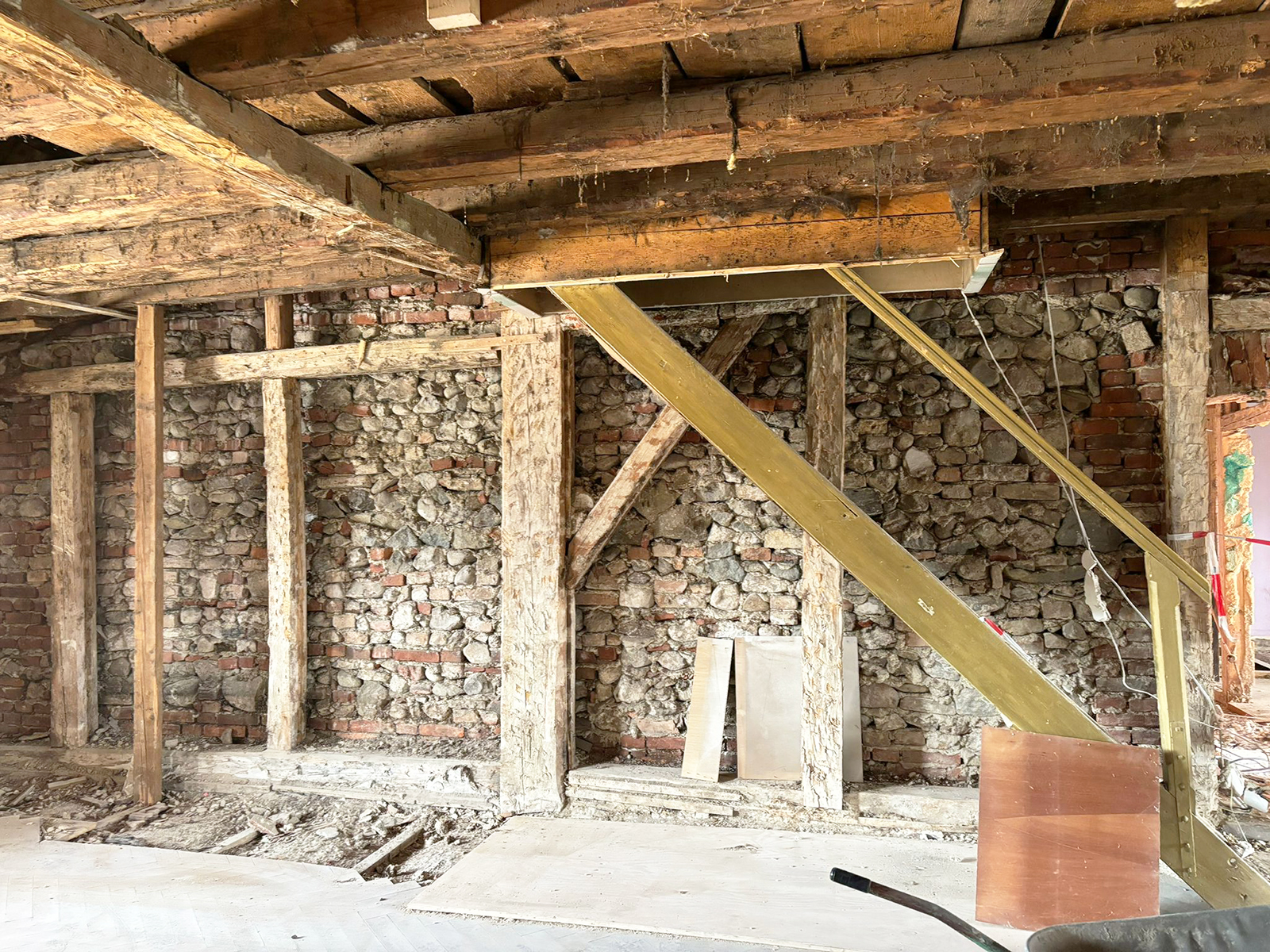 Die Bausubstanz wurde in großen Teilen gewahrt und durch konstruktiv erforderliche Bauteile ergänzt. Die Massivität des Baukörpers und der alte Charakter bleiben trotz des Einsatzes von WDVS durch traditionelle Putztechniken erhalten. Genauso feinfühlig wurden die Innenräume bearbeitet, wobei sich ergänzte Bauteile nicht verstecken. Gezielt wurden bestehende Materialien, wie das Bruchsteinmauerwerk im WC und die Ziegelwand im Foyer freigelegt und der imposante Holzdachstuhl im Saal inszeniert.