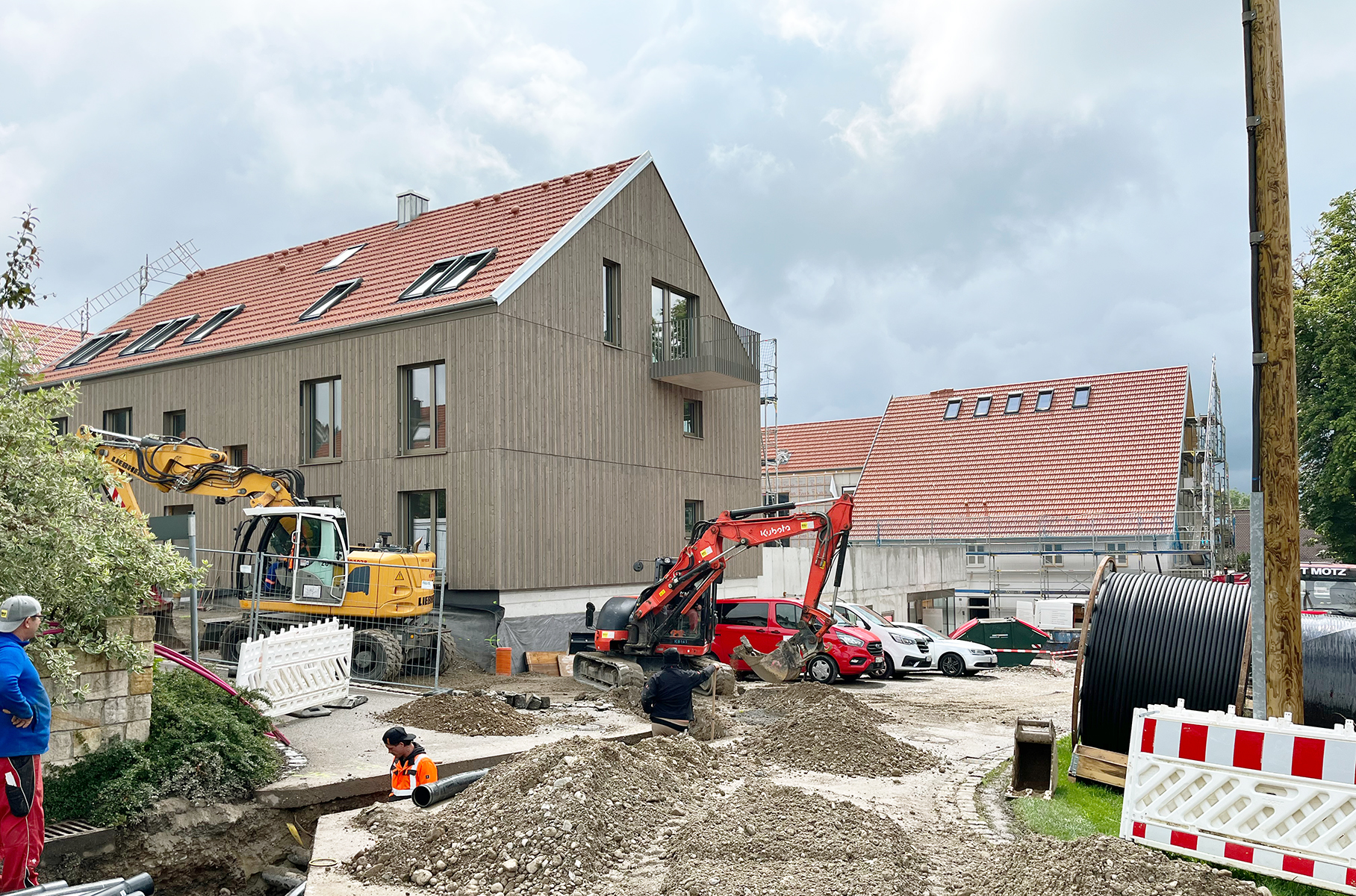 Der Wirtshalder Weg mündet auf den neuen Dorfplatz, der sich gerahmt vom Gasthof Hirsch mit seinem baumüberstandenen Biergarten und dem Dorfladen nach Westen zur grünen Mitte öffnet und den Blick auf die Kirche St. Cornelius und Cyprian freigibt. Ergänzt mit Maibaum, Dorfbrunnen und langer Bank wird er zum Treffpunkt und zur neuen Mitte.