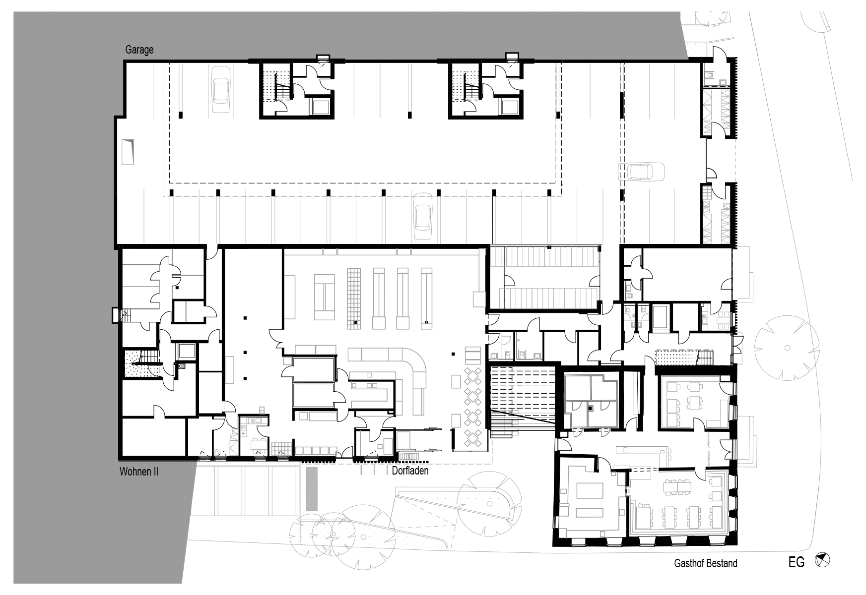 Eine großzügige Glasfront markiert den Eingang des Dorfladens und öffnet sich mit einem Café an der Ecke zum Dorfplatz. Der Laden sichert die Nahversorgung im Dorf und bildet einen Treffpunkt für Jung und Alt.