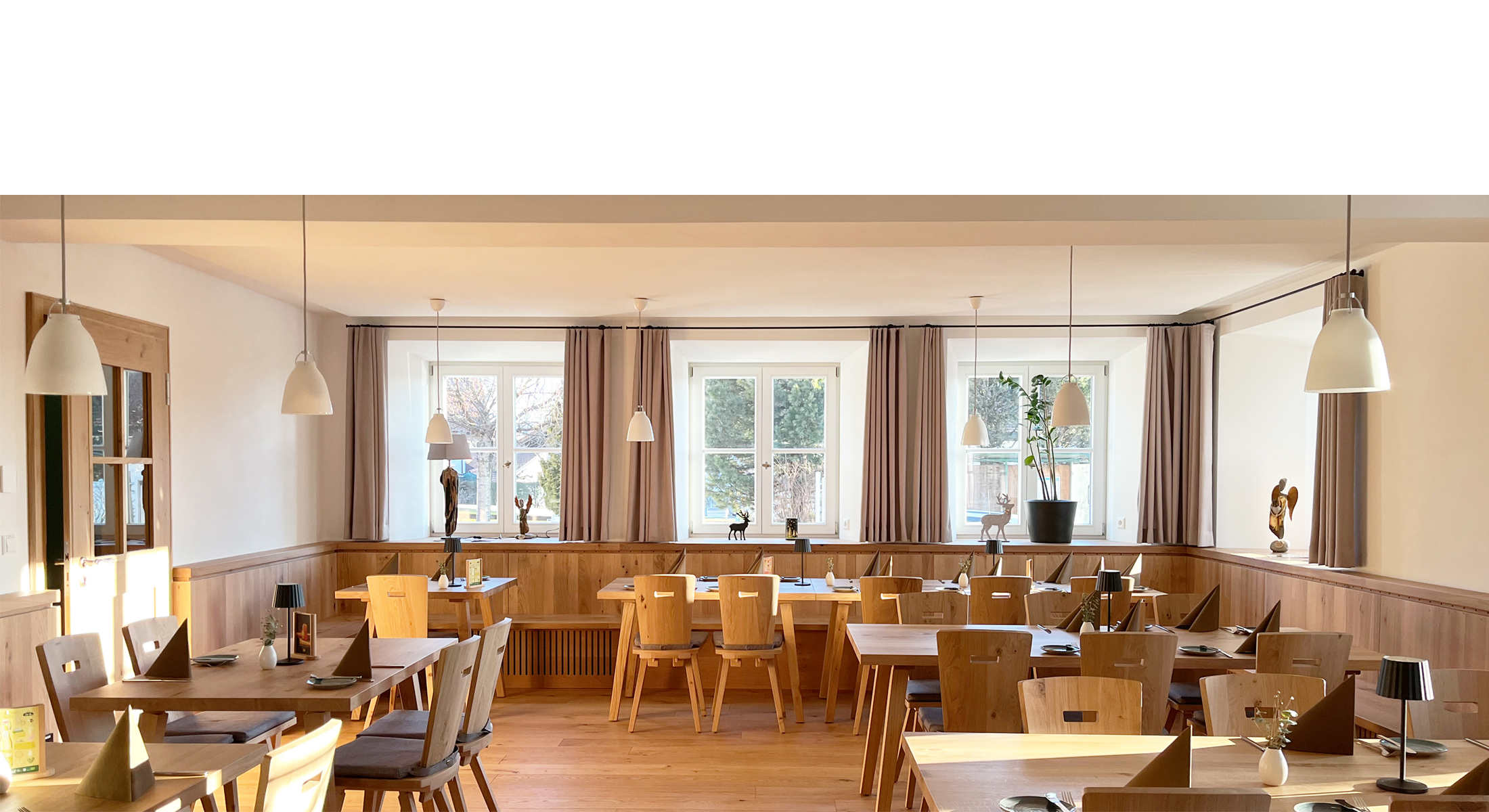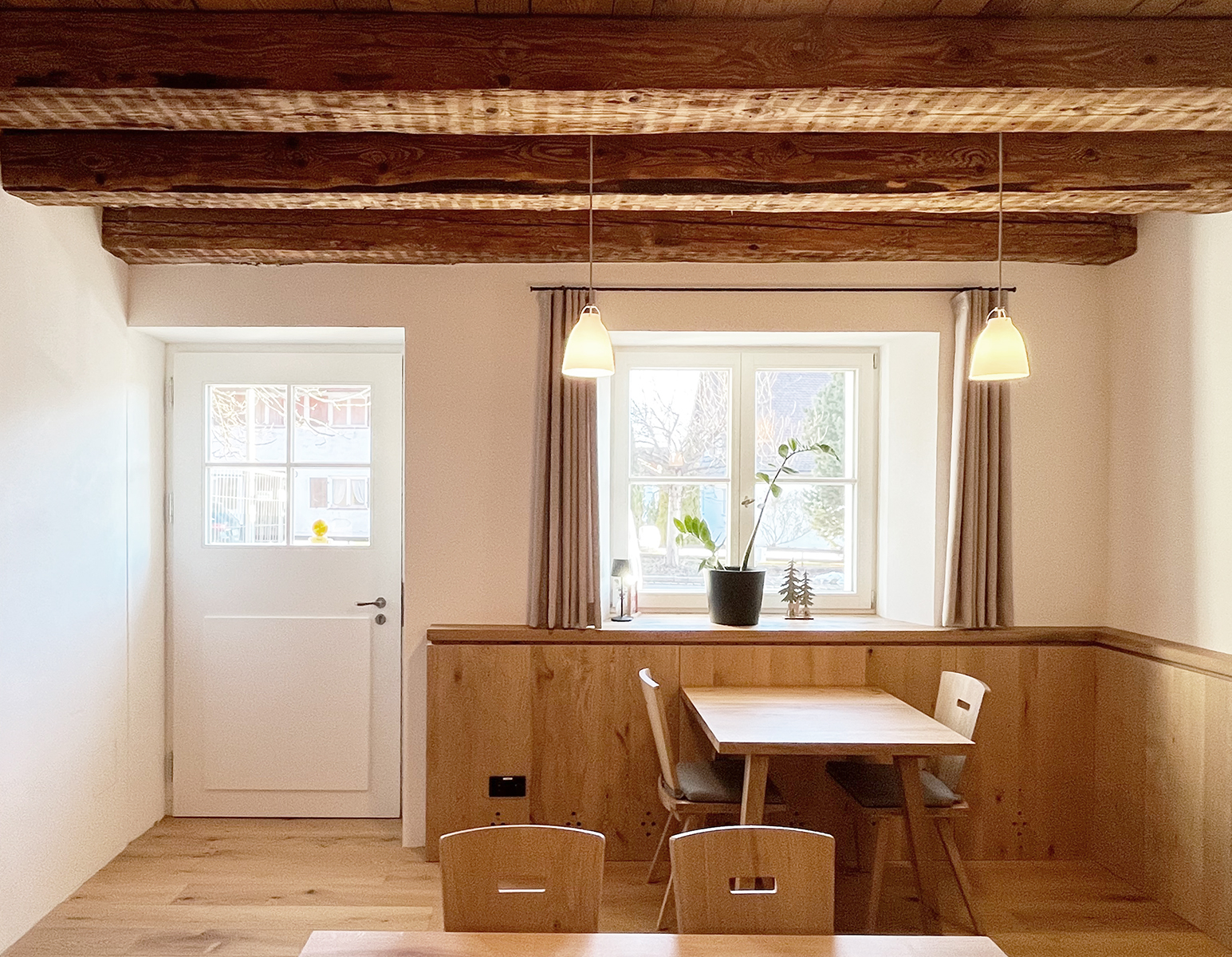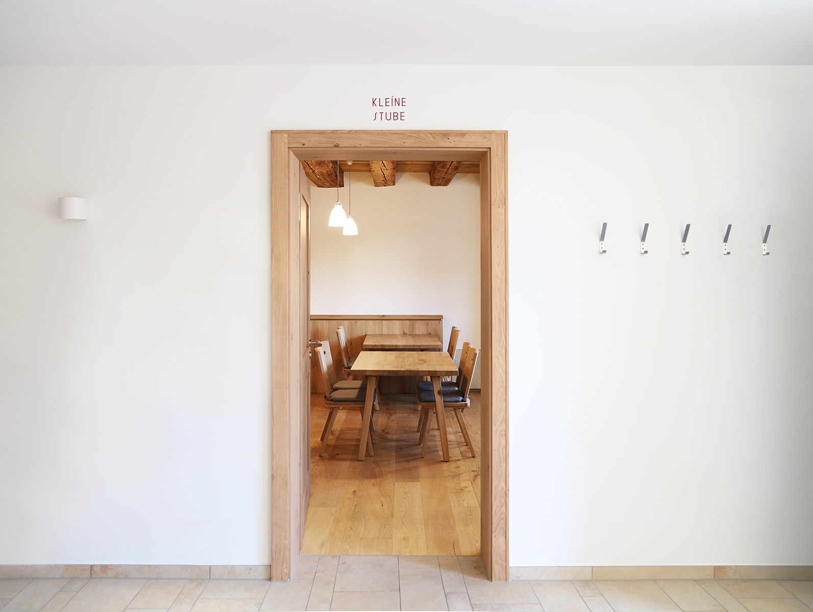 Eiche ist das dominierende Material in den Stuben im Erdgeschoss. Die Belegung des Bodens und die Fertigung der Sitzbank, Tische, Stühle und Theke schaffen einen natürlichen und heimeligen Charakter. Im Foyer, der WC-Anlage und in den Gästezimmern führt der gezielte Einsatz von Farben zu einem besonderen Erlebnis im gesamten Haus.
