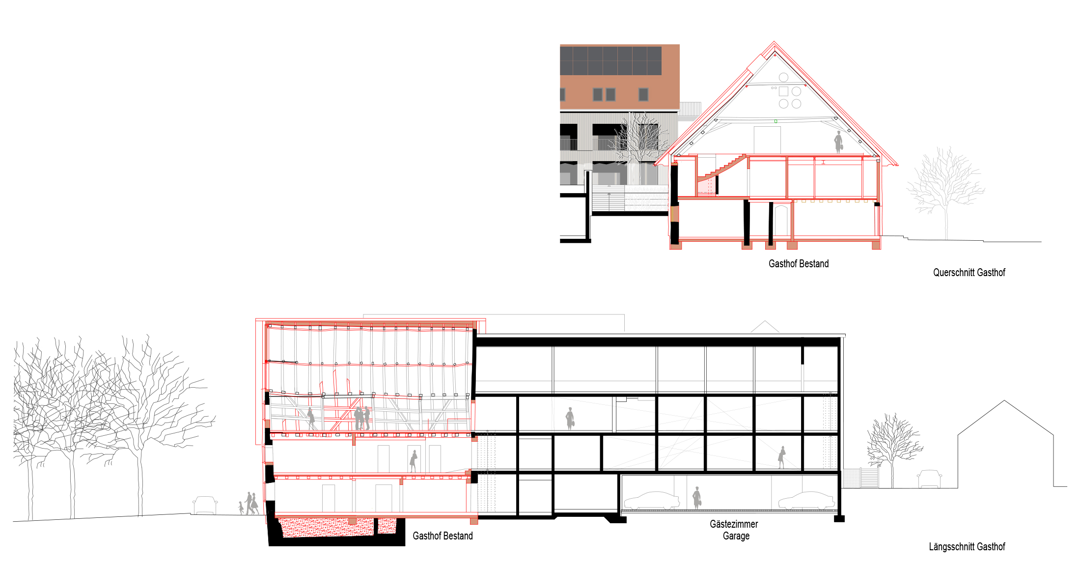 Ziel der Sanierung war es den Charakter des Gasthofes zu bewahren. Die Grundrissstruktur wurden weitestgehend erhalten. Lediglich die Belegung der Räume wurde teilweise anders organisiert. Empfangen wird man in der großzügigen Diele, die auch die Theke aufnimmt. Diese bildet eine offene Verbindung zur Stube. Eine moderne Küche gliedert sich direkt an und ermöglicht eine direkte Bewirtung des bestehenden Biergartens. Die Stube wurde durch eine Kleine Stube ergänzt. Im 1. Obergeschoss befindet sich eine Betriebswohnung, Personal- und Nebenräume und eine großzügige WC-Anlage. Im Saal unter dem Dach wird die grandiose Konstruktion des liegenden Dachstuhls gefeiert und erlebbar. Der neue Längsbau schließt über ein als Fuge interpretiertes Treppenfoyer an das Bestandsgebäude an. Es dient als neue, barrierefreie Erschließung des Gasthofs, des Saals und der Gästezimmer.