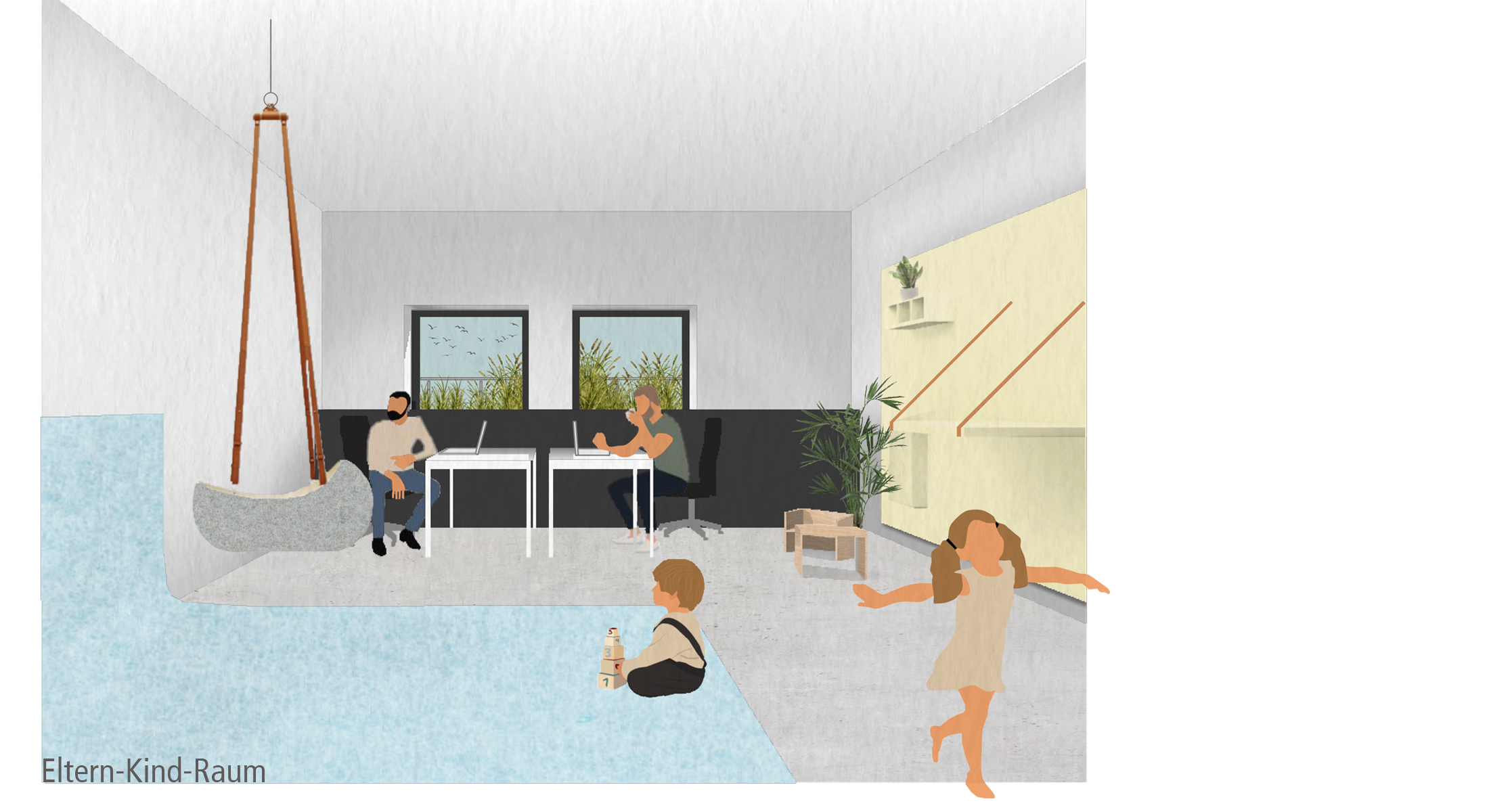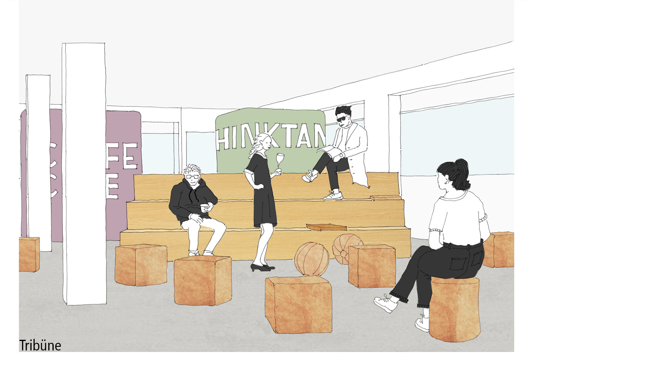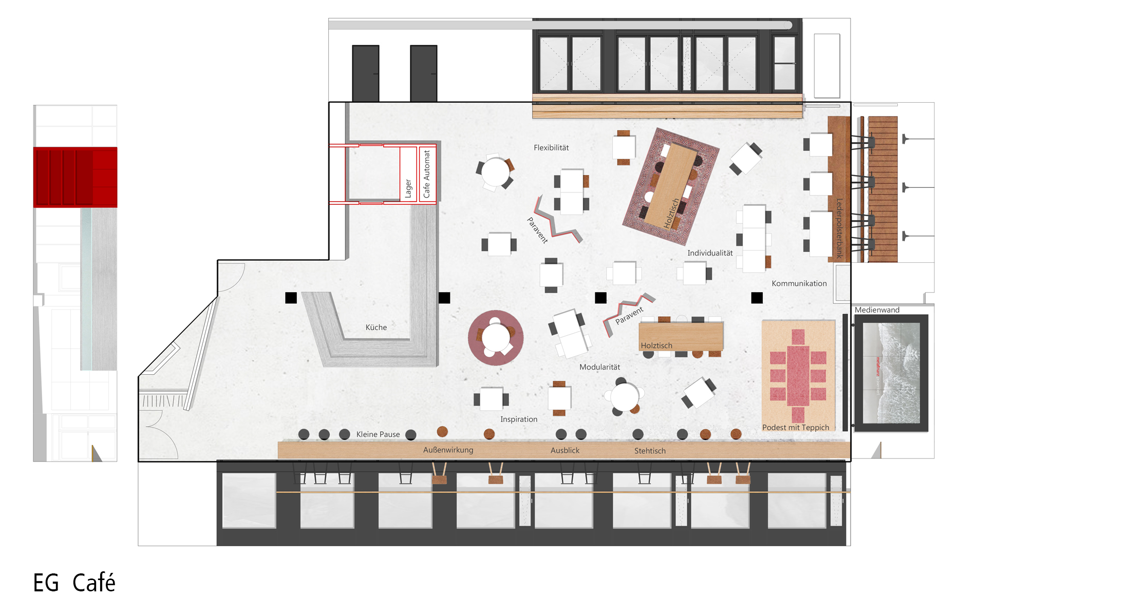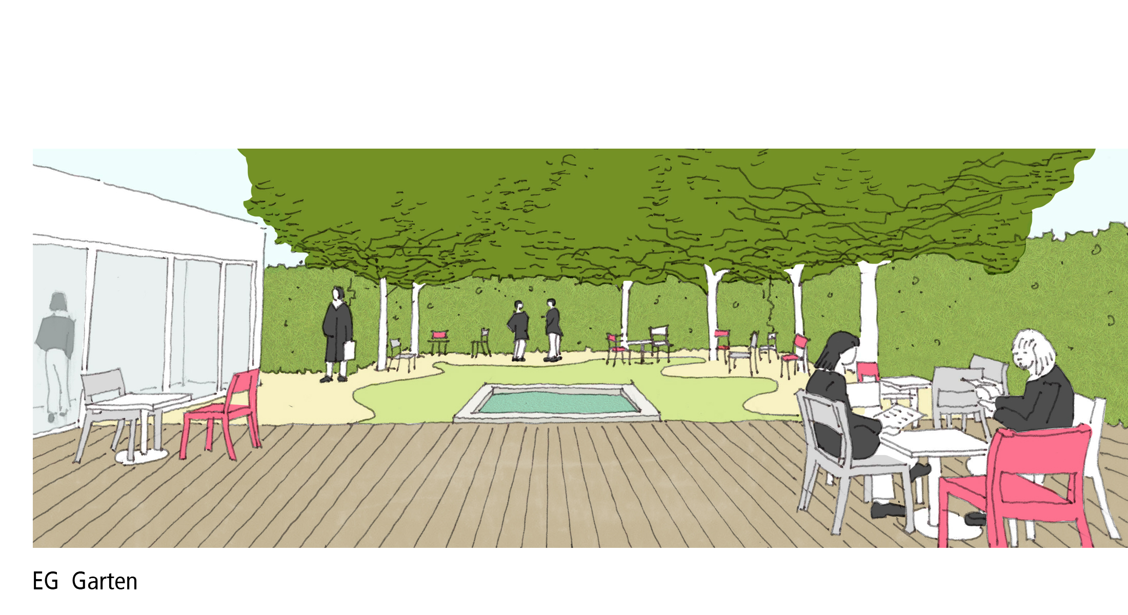 Zu einer großen Pause, lädt das öffentlich wirkende Café im Erdgeschoss ein. Der offene kommunikative Raum führt zu einem Austausch untereinander. Im angegliederten, introvertierten Garten kann man die Seele baumeln lassen und zur Ruhe kommen.