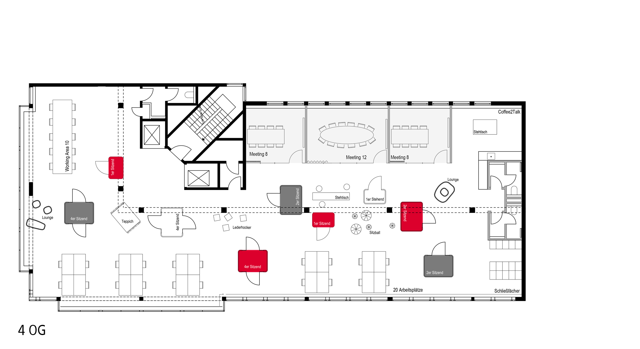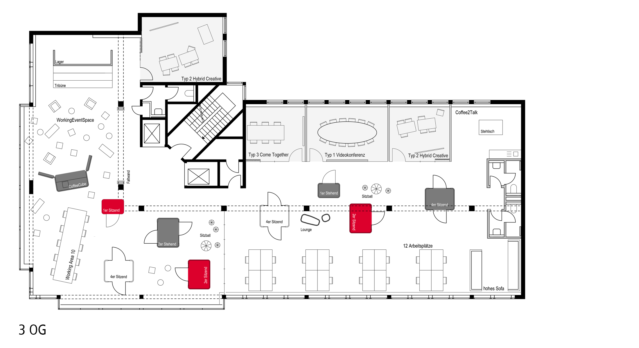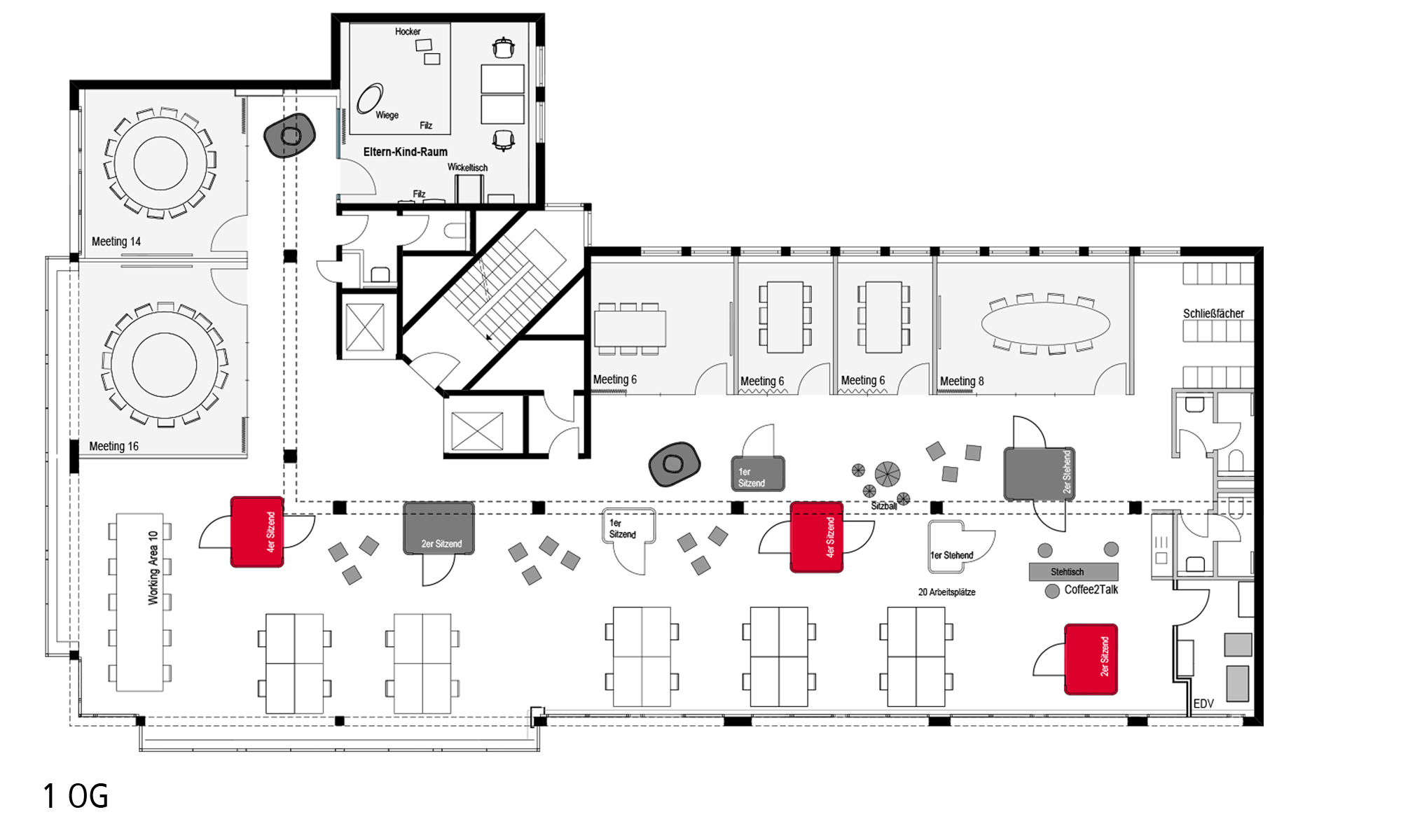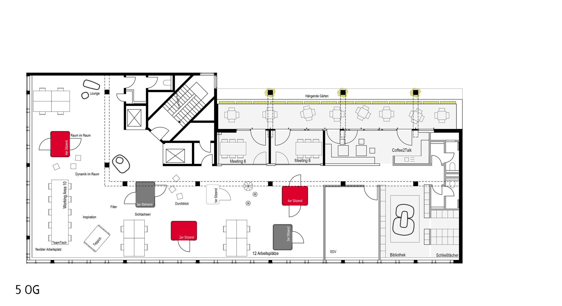 Der Fokus lag auf der gesamtheitlichen Betrachtung des Gebäudes mit dem Ziel bestehenden Strukturen zu hinterfragen und ein neues Raumangebot für eine sich stetig ändernde Arbeitswelt zu schaffen. Das Aufbrechen von Zellen- und Einzelbüros und die Transformation in Open Space Flächen in Ergänzung mit flexibel gestalteten Meetingbereichen und Ruhezonen ermöglicht den Mitarbeitern ein individuelles auf die jeweiligen Bedürfnisse ausgerichtetes Arbeiten.
