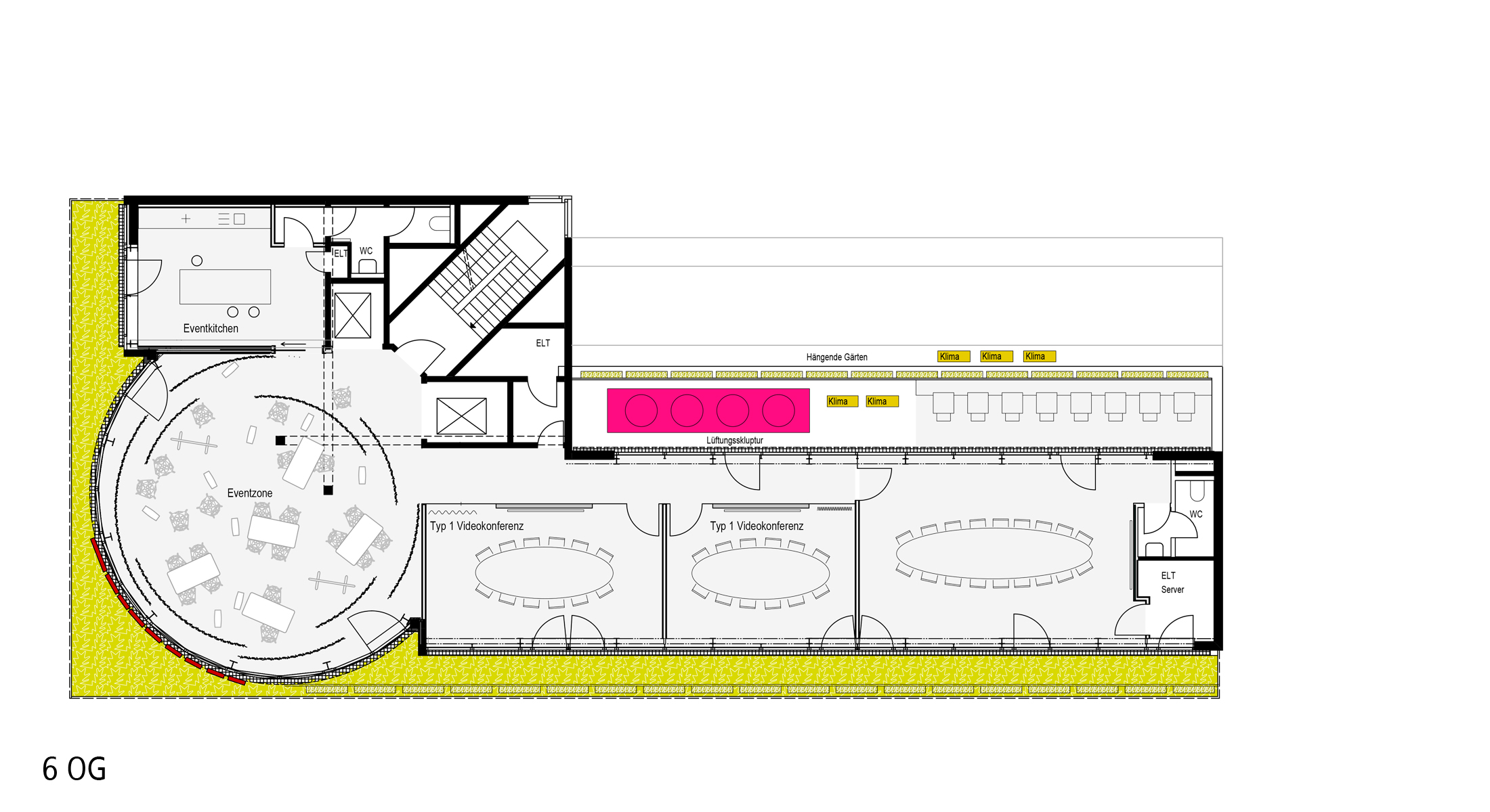 Meetingräume unterschiedlicher Größen verteilen sich über alle Ebenen. Sie sind jeweils nur einseitig angeordnet. Zur offenen Bürolandschaft hin schließen sie mit einer Glaswand ab. Der Einblick kann mit Hilfe eines Vorhangs ausgeschaltet werden.