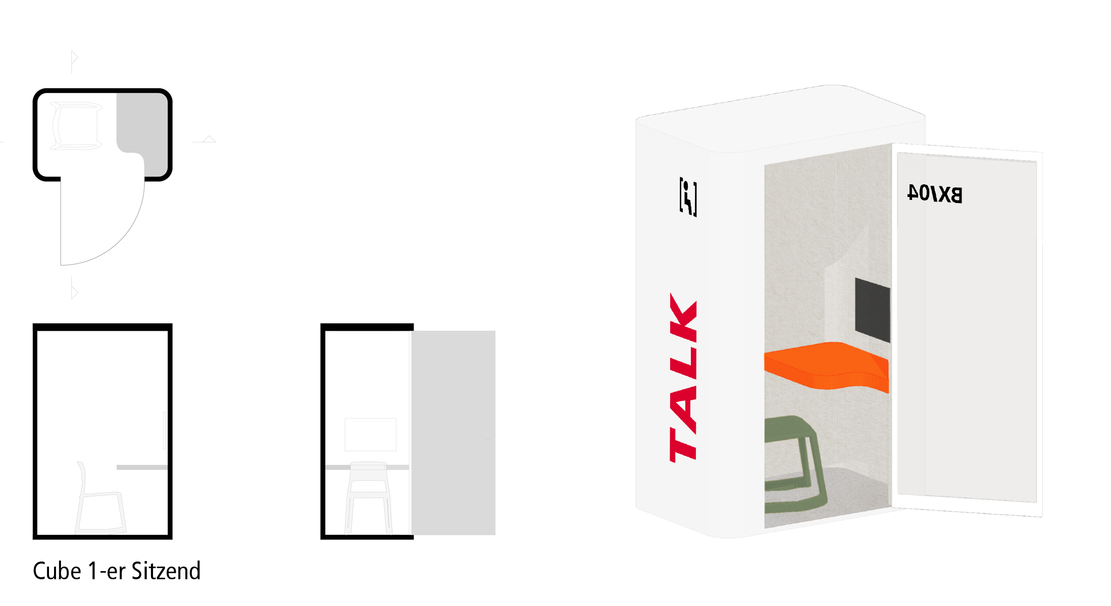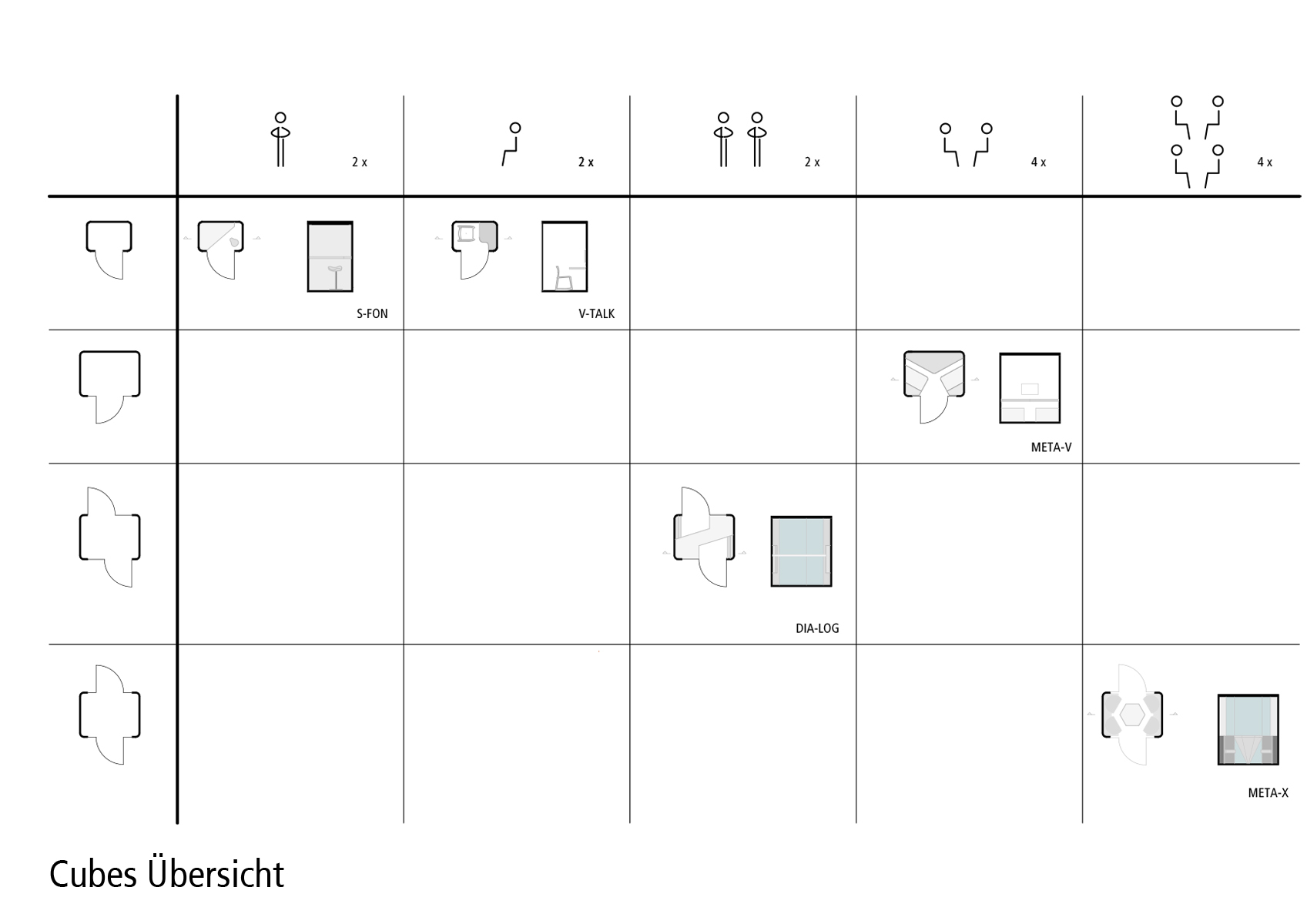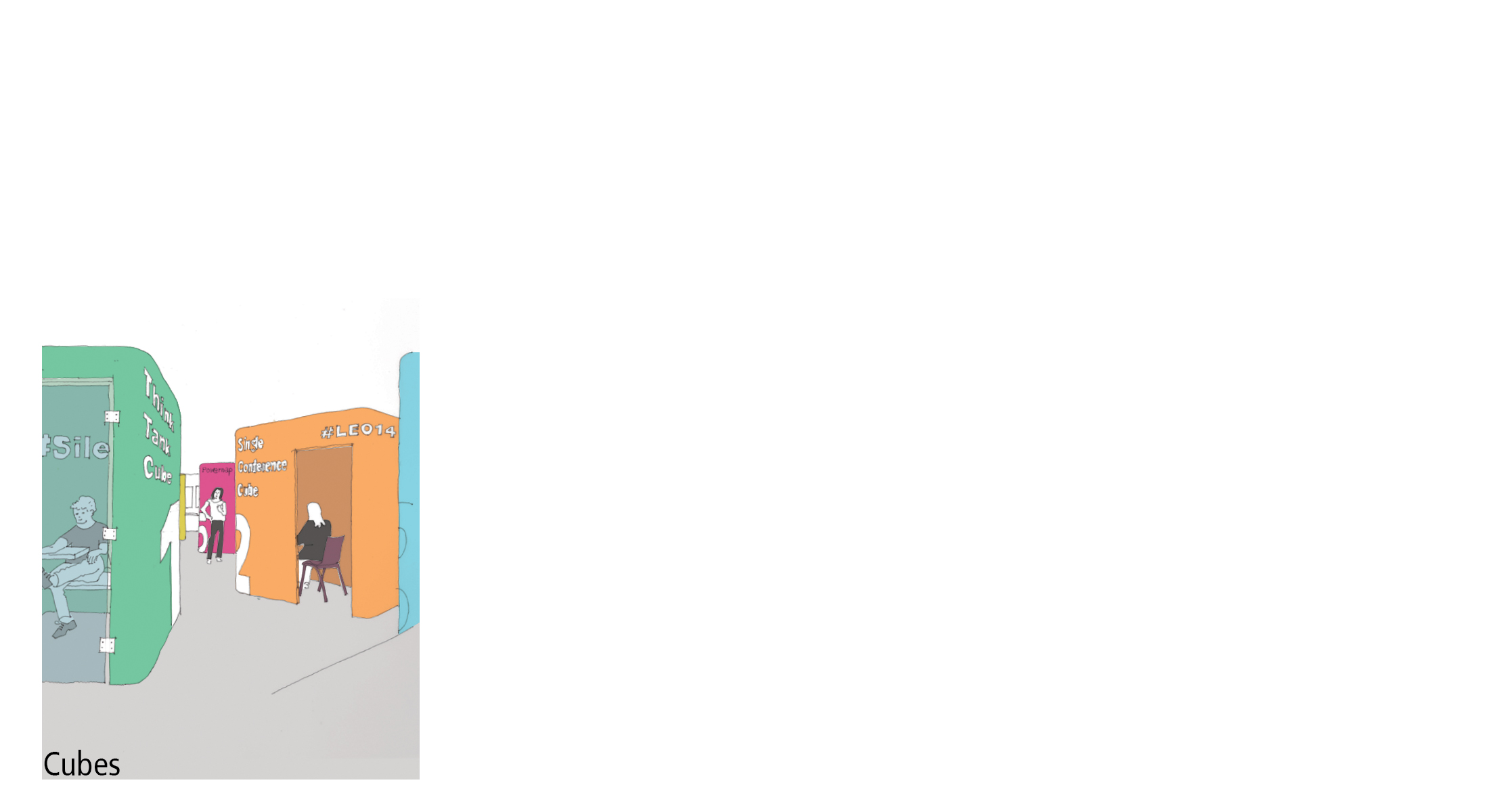 Schallisolierte Kapseln verschiedener Größen werden in die offenen Arbeitsräume eingefügt, um konzentriertes Arbeiten zu ermöglichen. Ausgehend von einem freistehenden, modularen System können die Rückzugsboxen für eine bis maximal vier Personen sein. Die Außenseite der Kapseln ist einfarbig lackiert mit großformatiger Beschriftung; dabei kommt ein Dreiklang von Farben zum Einsatz. Ihr Inneres ist individuell ausgekleidet. Die Boxen garantieren höchste Vertraulichkeit.