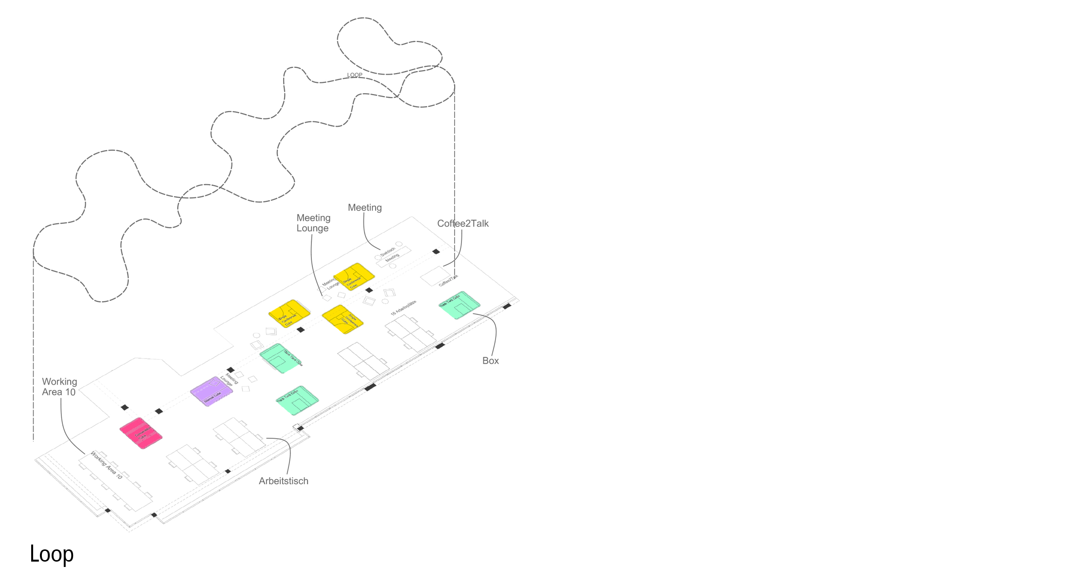Als Loop wird eine frei schwingende Linie bezeichnet, die in einer offenen Bürolandschaft hierarchiefrei verschiedene Bereiche umfährt und verbindet. Der Loop bewegt die Leute dazu aneinander vorbeizugehen und sich zu begegnen, um die Kommunikation zu fördern und die Zusammenarbeit zu stärken.