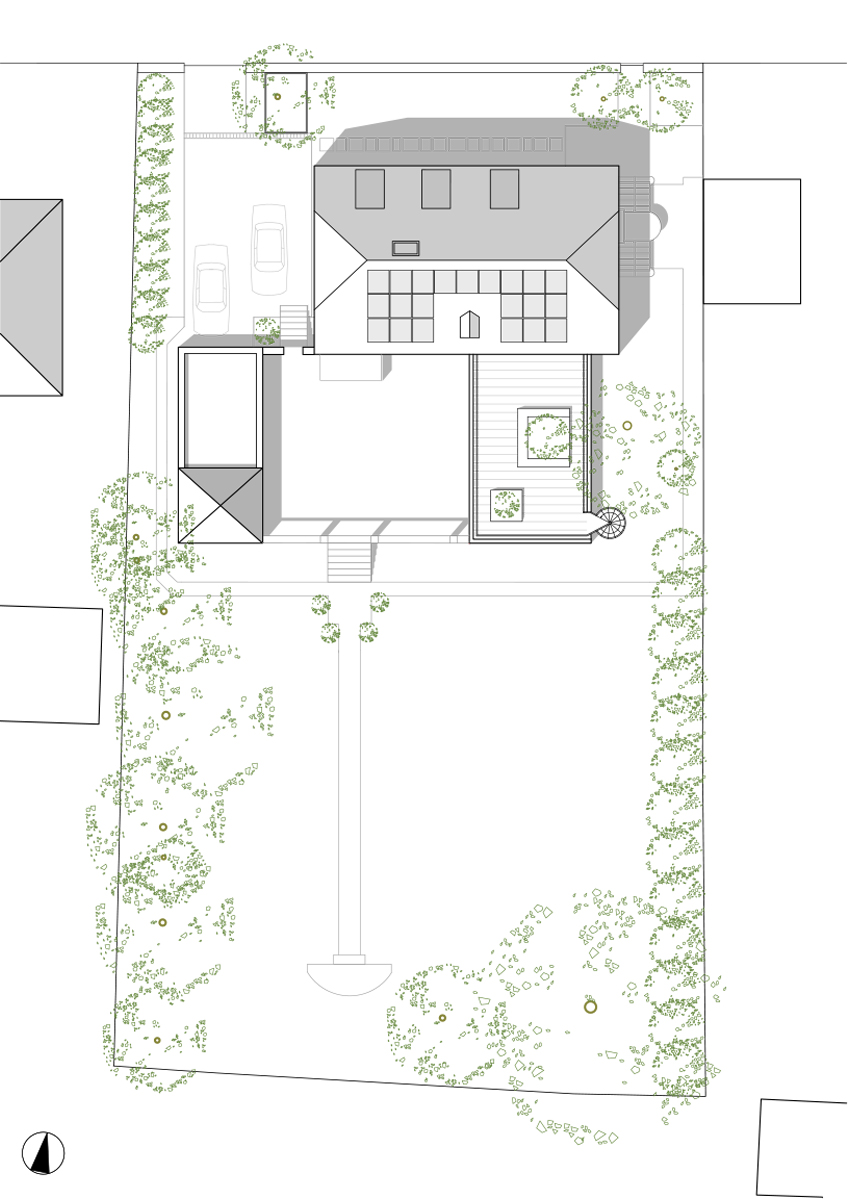 Der neue Anbau ist ebenfalls erdgeschossig. Er reicht bis an die Südgrenze des Terrassenhofs und schließt exakt mit seiner Südgrenze ab. Mit dem bestehenden Garagen- und Wintergartengebäude im Westen entsteht eine dreiseitige Umfassung des Terrassenhofs. Das Flachdach wird als Dachterrasse genutzt.