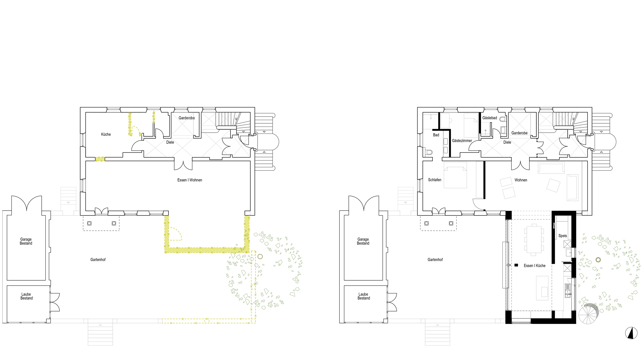 Neben dem Anbau ermöglichen die minimalen Eingriffe im Erdgeschoss die Unterbringung der Räumlichkeiten für die Großeltern.
