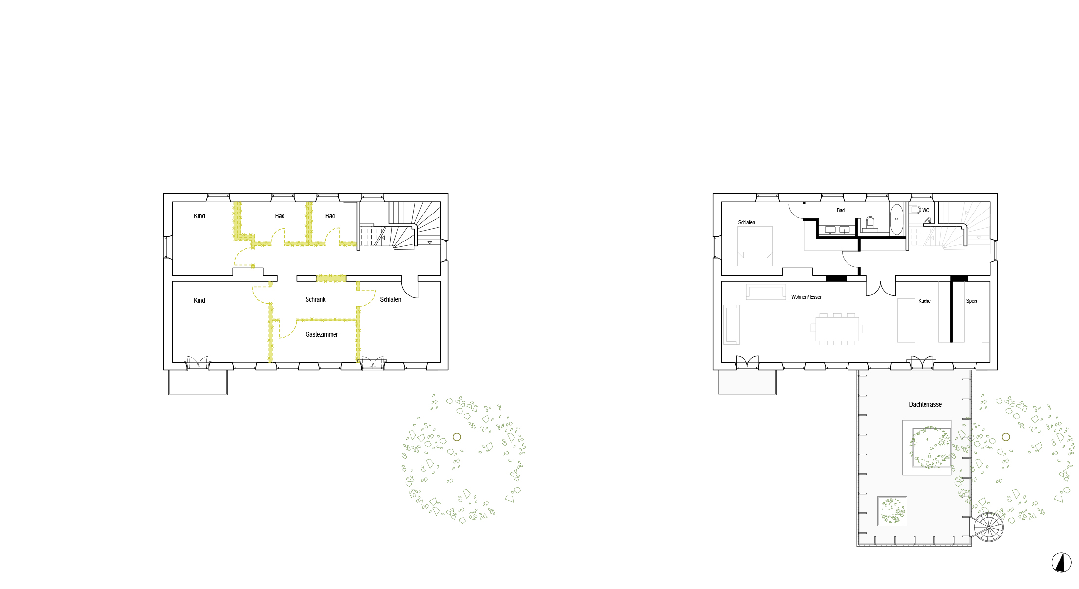 Die Abbruchmaßnahmen in den Obergeschossen schaffen einen großzügigen Wohnraum mit Dachterrasse für die junge Familie. Unter dem Dach entstehen durch die neue Raumgliederung Rückszugsmöglichkeiten für die Kinder. Die neuen Dachgauben bringen viel Tageslicht in die Räume.