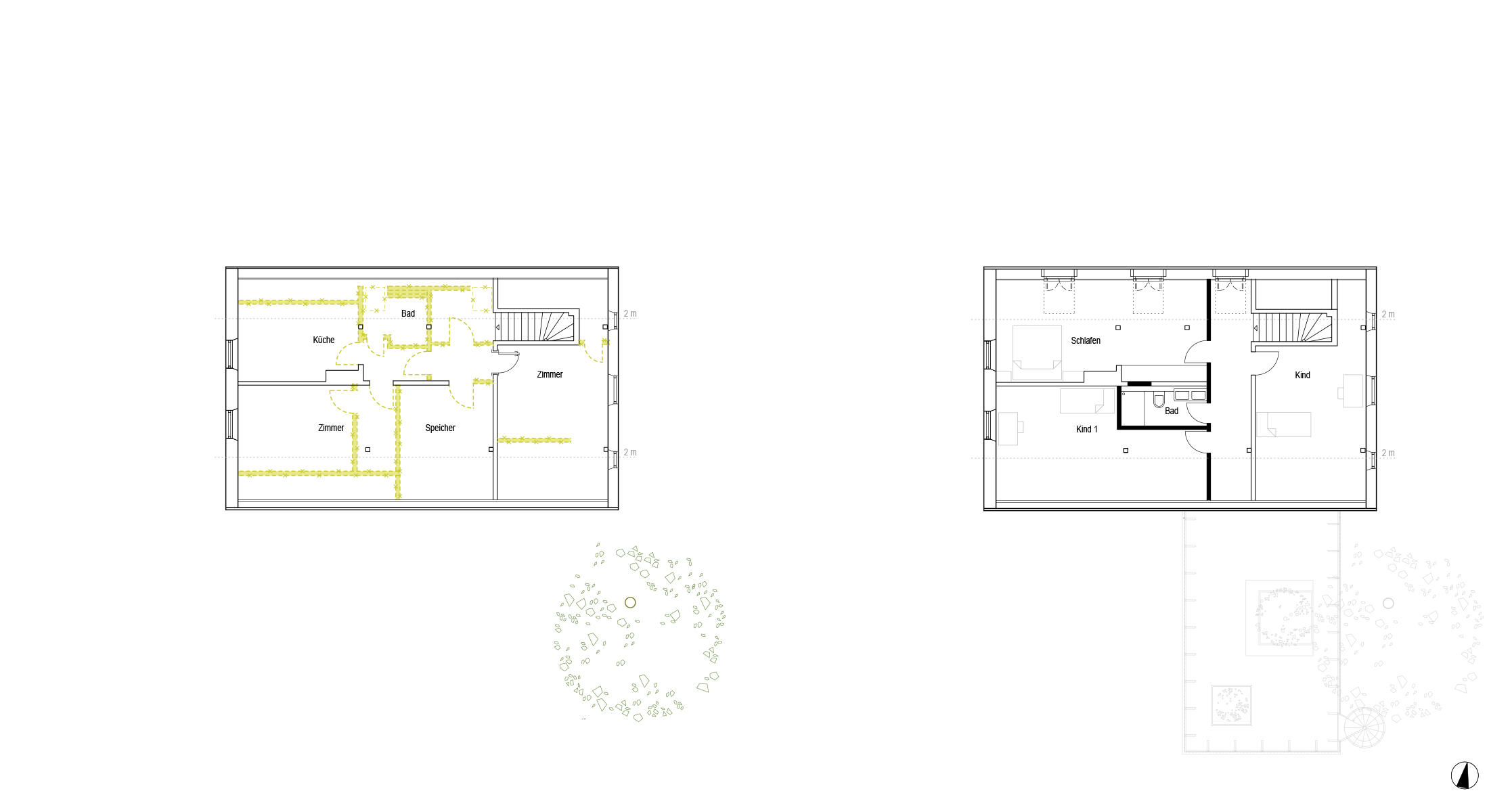Mit dem Anbau entsteht ein Ess- und Küchenbereich. Die Deckenhöhen sind differenziert. Im Zentralbereich beträgt die Raumhöhe 2,50 m und in den Randbereichen wie Küche, Sitzfenster, Fensterstürze, Sturz im Übergang zum Altbau reduziert sich diese auf 2,30 m.