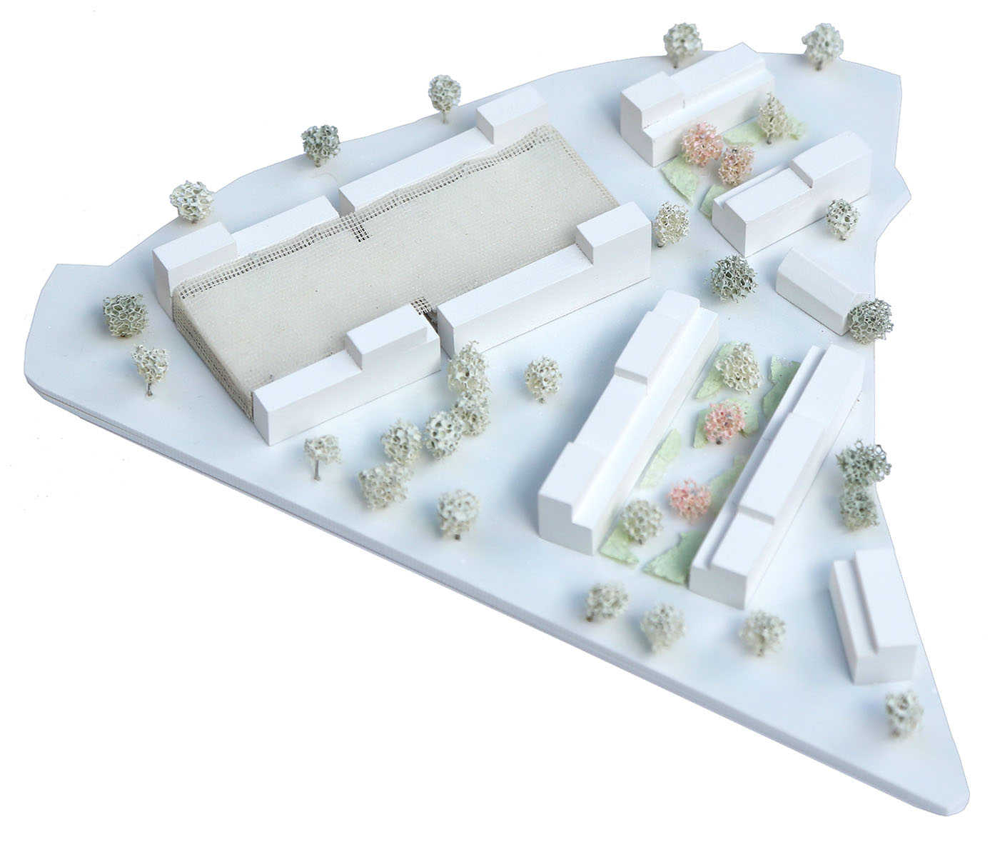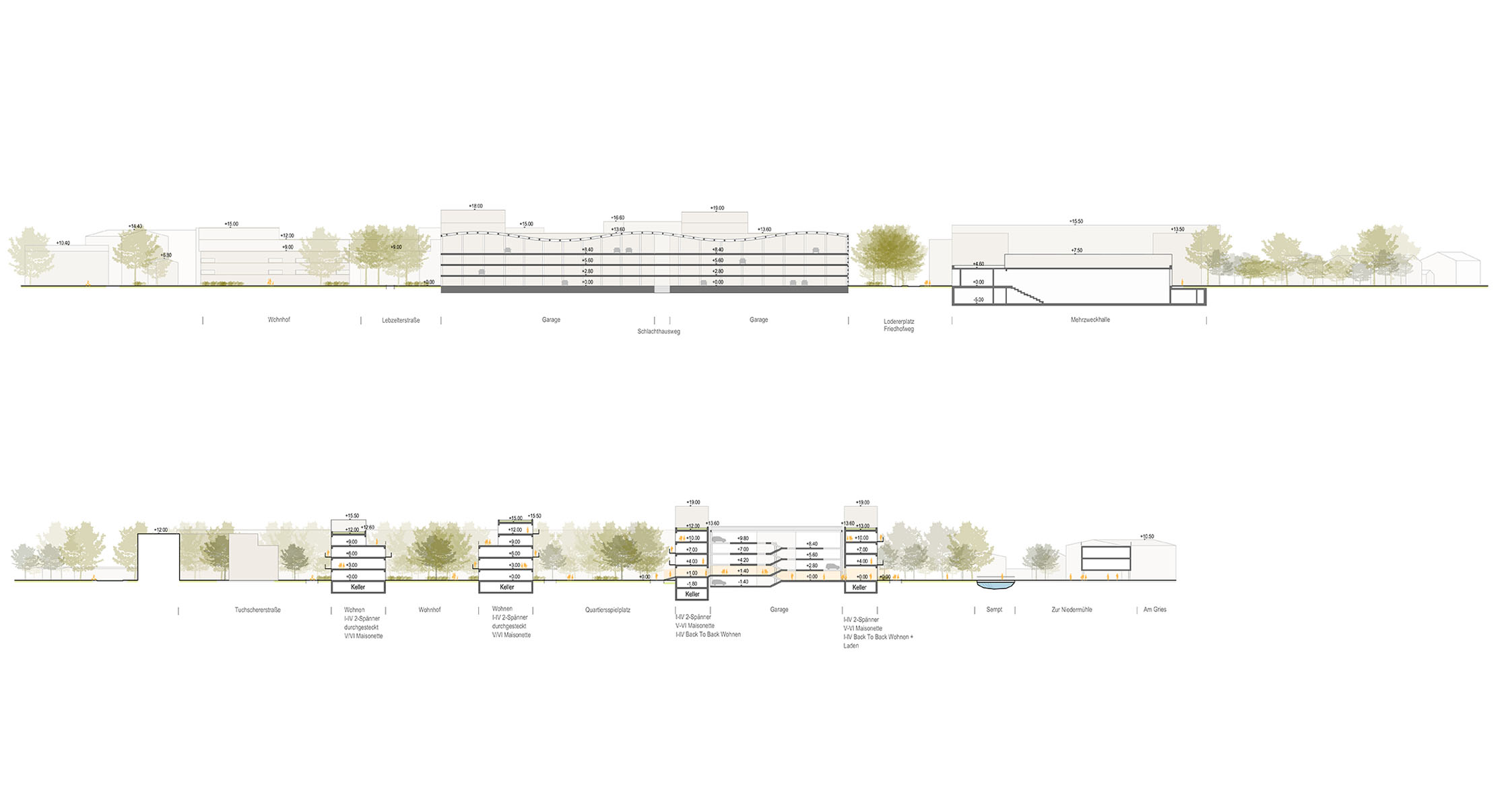 Die städtebauliche Setzung leitet sich aus der direkten Umgebung ab: Das Wettbewerbsgebiet ist Teil des „Verknüpfungsraums“ der als Bindeglied zwischen Altstadt und der Umgebung außerhalb der Anton-Bruckner-Straße fungiert. Die Körnung der Baukörper und Freiflächen wird außerhalb des Grünen Rings gröber. Großformatige Baukörper, eingebettet in weiträumige Freiflächen, wie die Grund- und Mittelschule, die Multifunktionshalle oder die Wohnbebauung an der Franz-Weindler-Straße in der Semptschleife werden aufgegriffen und neu interpretiert: Jeweils zwei parallele Zeilen fassen, wie ein Sandwich, einen rechteckigen Wohnhof mit dichten, privaten Strauchgärten in ihrer Mitte ein. Die Großgarage wird ebenfalls von Wohnzeilen eingefasst, die in einer autoreduzierten Zukunft schrittweise privaten Gärten weicht.