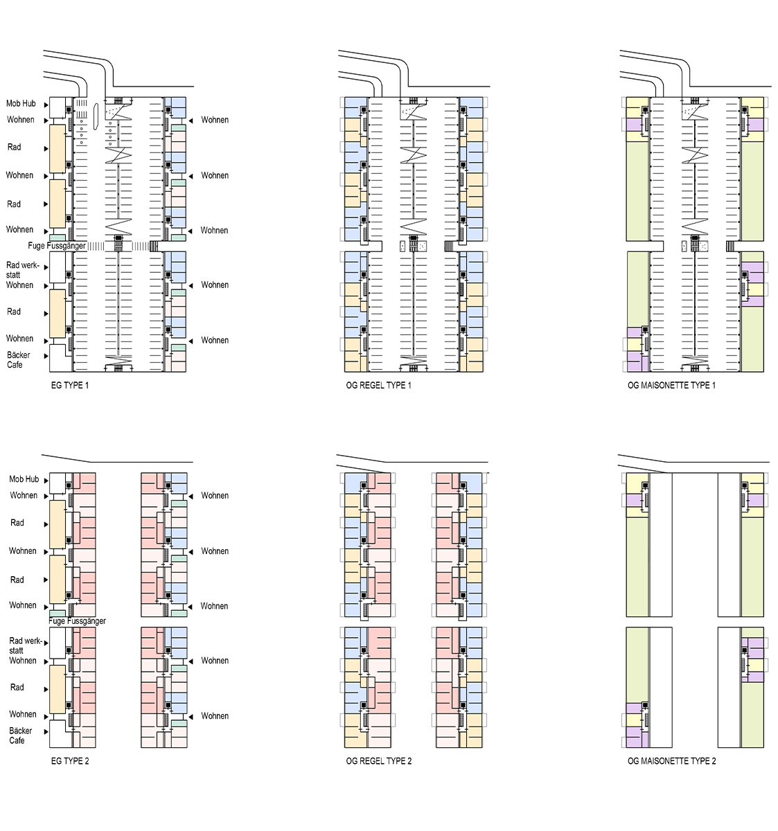 Zwischen die Großformen sind kürzere Wohnzeilen wie das Bestandshaus gestreut; aus diesem Grund entfällt die Variantendarstellung. Die Gebäude mit ihren privaten Freiflächen bilden kompakte Einheiten die von öffentlichen Grünräumen großzügig umspült werden. Durchlässigkeit statt räumlicher Zäsuren verknüpfen Altstadt und Umgebung.