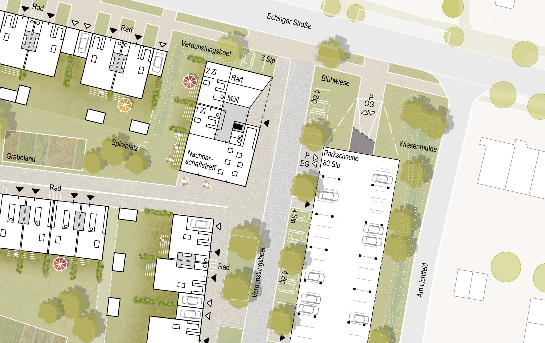 Die Straße Am Lichtfeld bildet mit einem breite baumbestandenen Wiesenstreifen den bestehenden, westlichen Rand des Orts. Eine weitere Straße parallel zur Straße Am Lichtfeld erschließt das neue Quartier, optional auch zukünftige, südlich angrenzende Bauflächen und schafft zusammen mit der Straße Am Lichtfeld einen breiten Anger, der auch von den Anwohnern Am Lichtfeld genutzt werden kann. Er nimmt die Parkscheune und die Energiezentale auf und hat Platz für eine große Wiese mit Spielplatz und naturnahe Retentionsflächen. Die Verkehrsfrequenz Am Lichtfeld bleibt damit unverändert.